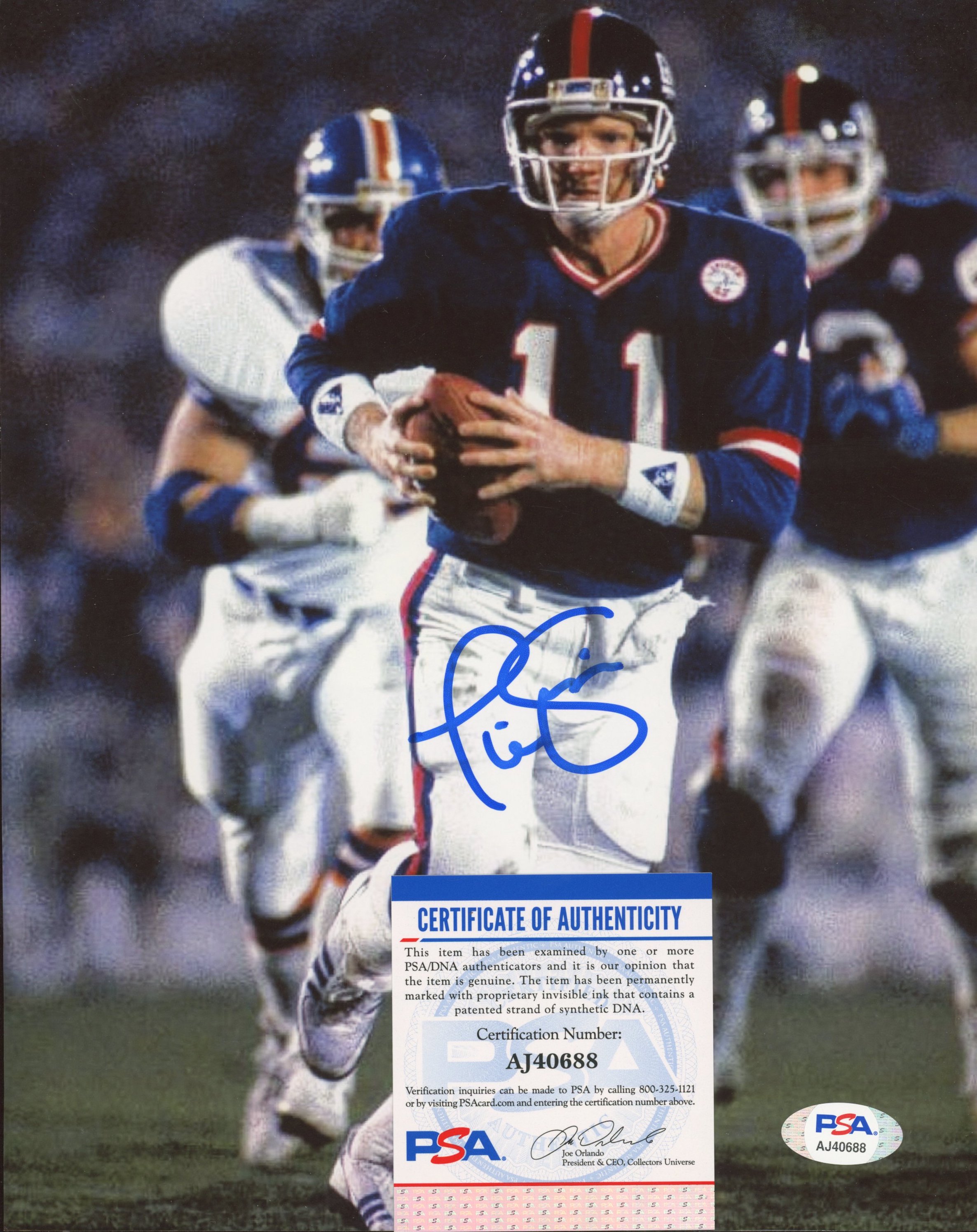 Photo measures 8" x 10" in size and has been hand-signed by Phil Simms (New York Giants).
