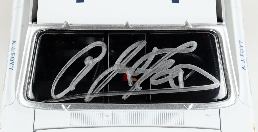 Premium University of Racing Legends die-cast car hand-signed on the windshield by A.J. Foyt. The car is a premium diecast car with incredible detail.