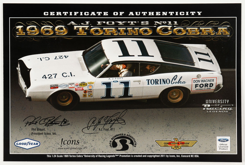 A.J. Foyt Signed NASCAR #11 1969 Torino Cobra 1:24 Premium Diecast Car (PA COA)