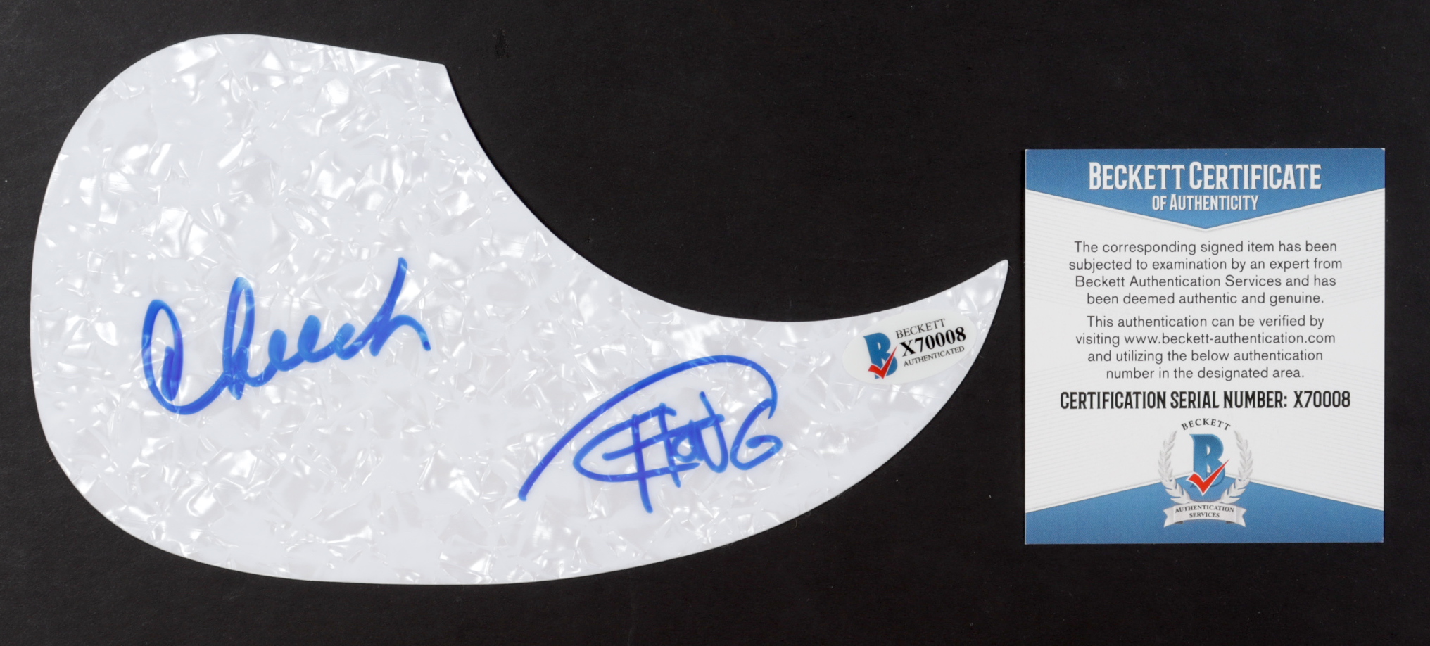Acoustic guitar pickguard has been hand-signed by Cheech Marin and Tommy Chong.