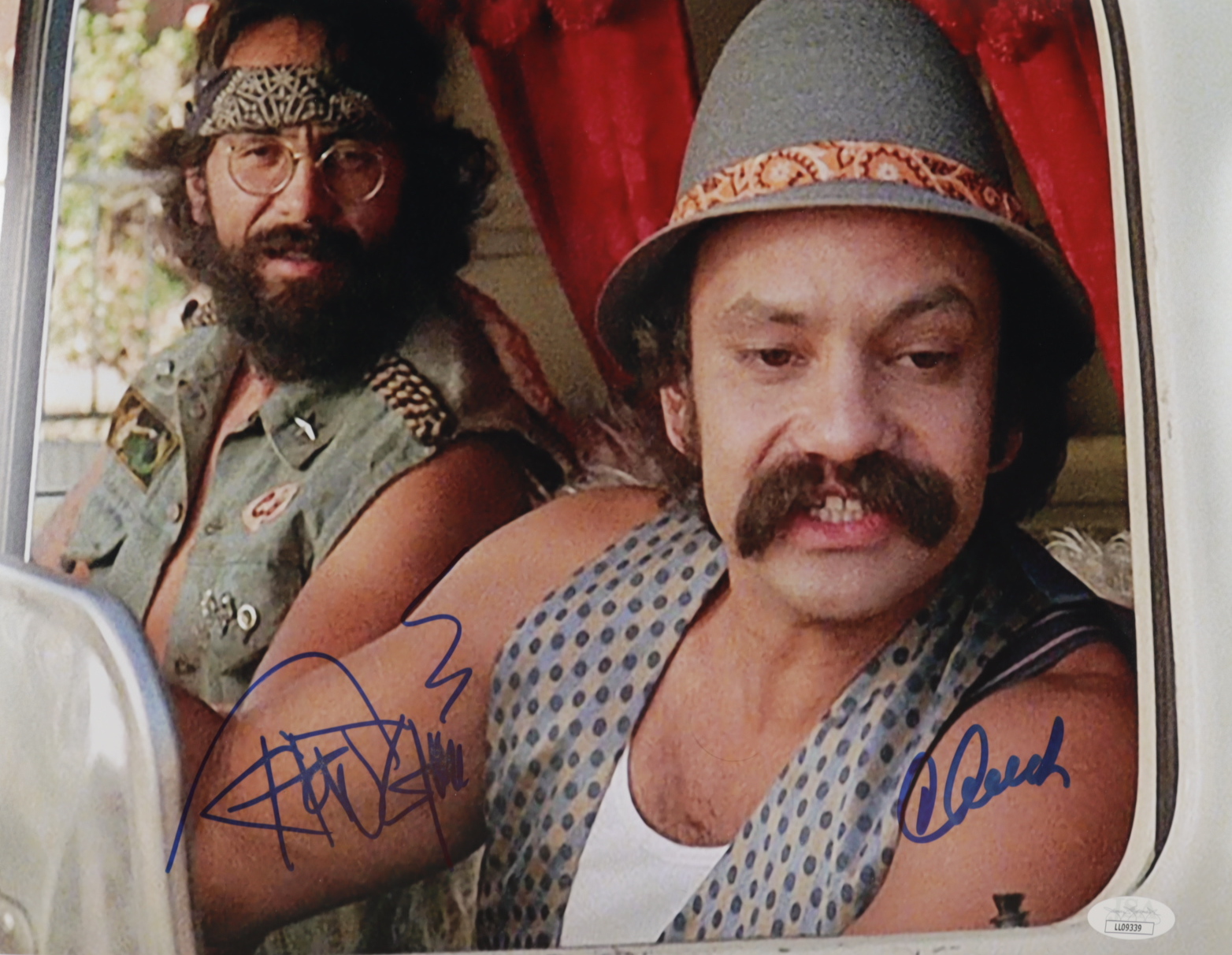 Photo measures 11" x 14" in size and has been hand signed by Cheech Marin and Tommy Chong. Please note, signature shows signs of bleeding.