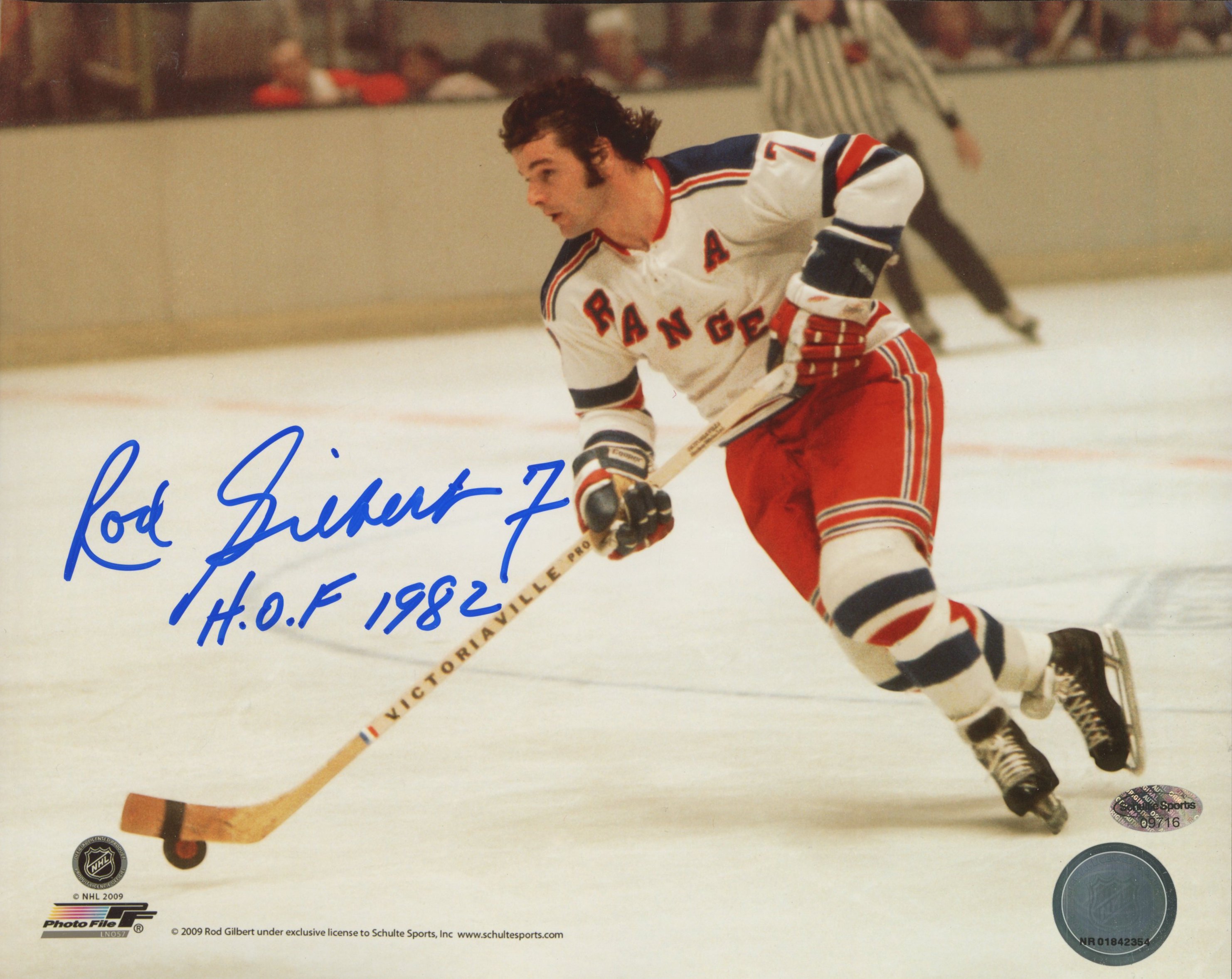 Photo measures 8" x 10" in size and has been hand-signed and inscribed by Rod Gilbert (New York Rangers, HOF).