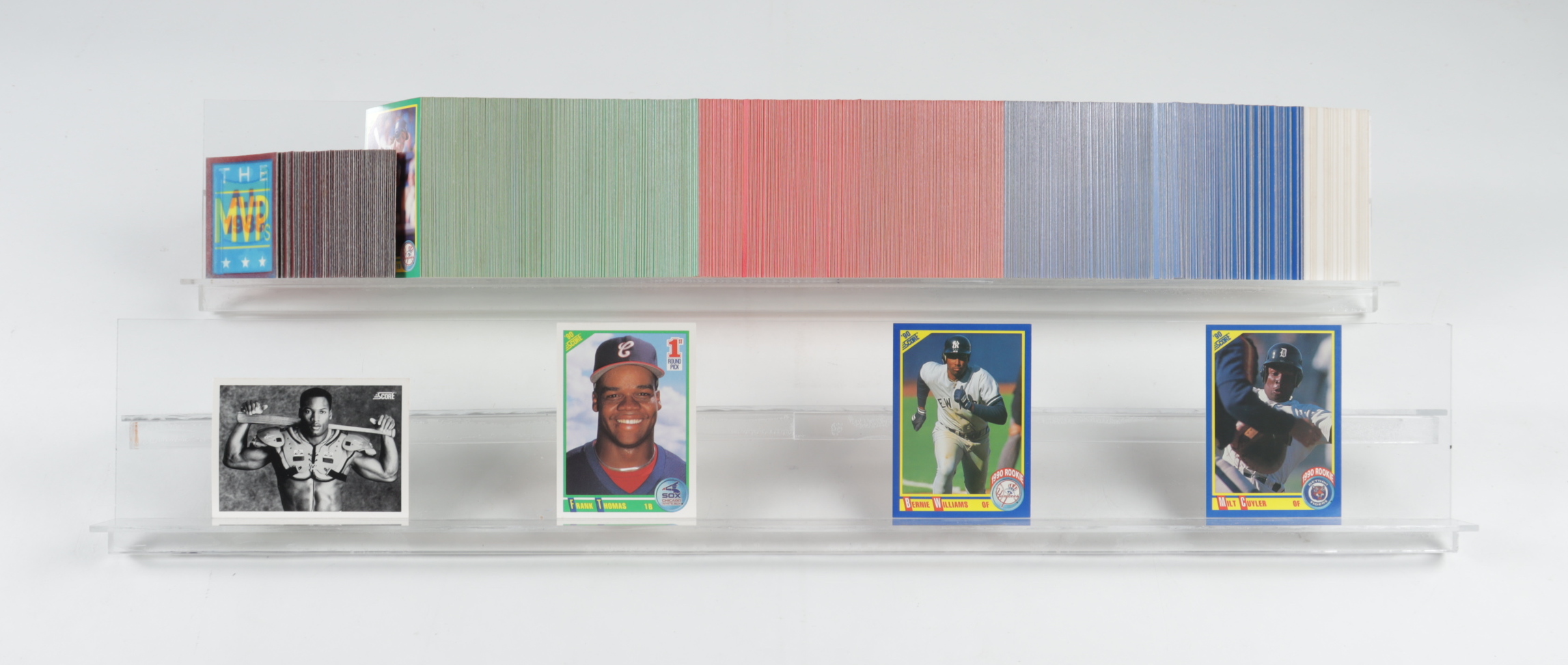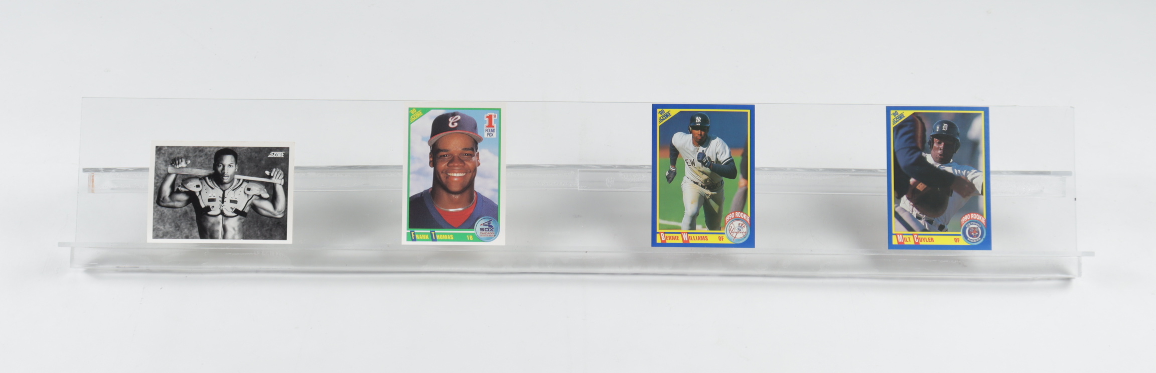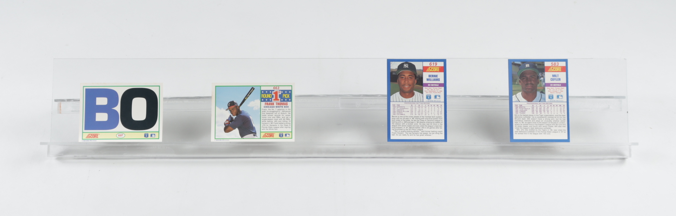 The 1990 Score set contains 724 standard-size cards. The front borders are red, blue, green or white. The vertically oriented backs are white with borders that match the fronts, and feature color mugshots. Subsets include Draft Picks (661-682) and Dream Team (683-695). A special black and white horizontal-designed card of Bo Jackson in football pads holding a bat above his shoulders was a big hit in 1990. Rookie Cards of note include Juan Gonzalez, Dave Justice, Chuck Knoblauch, Dean Palmer, Sammy Sosa, Frank Thomas, Mo Vaughn, Larry Walker and Bernie Williams.
