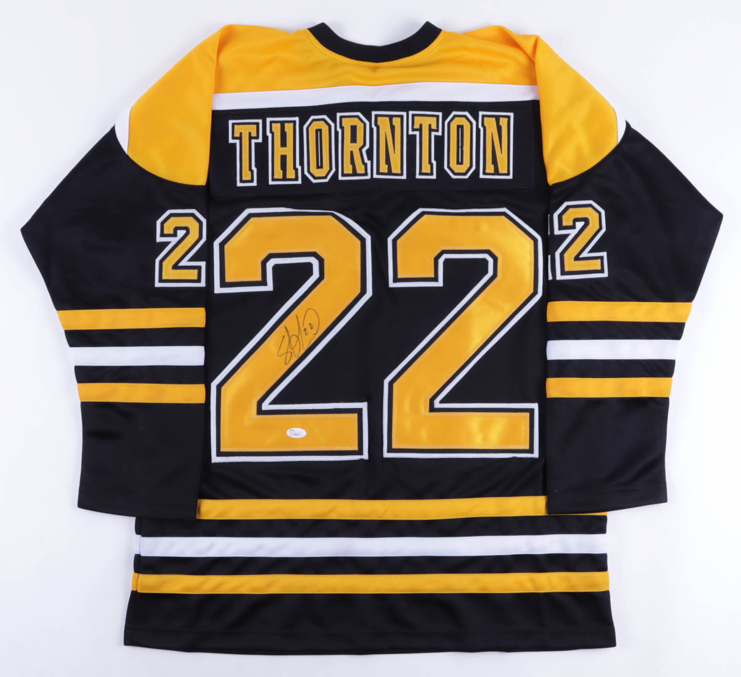 Custom on-ice style jersey. Everything is sewn on, size XL. Hand-signed by Shawn Thornton. Please note, mark on back of jersey under name and on sleeve.