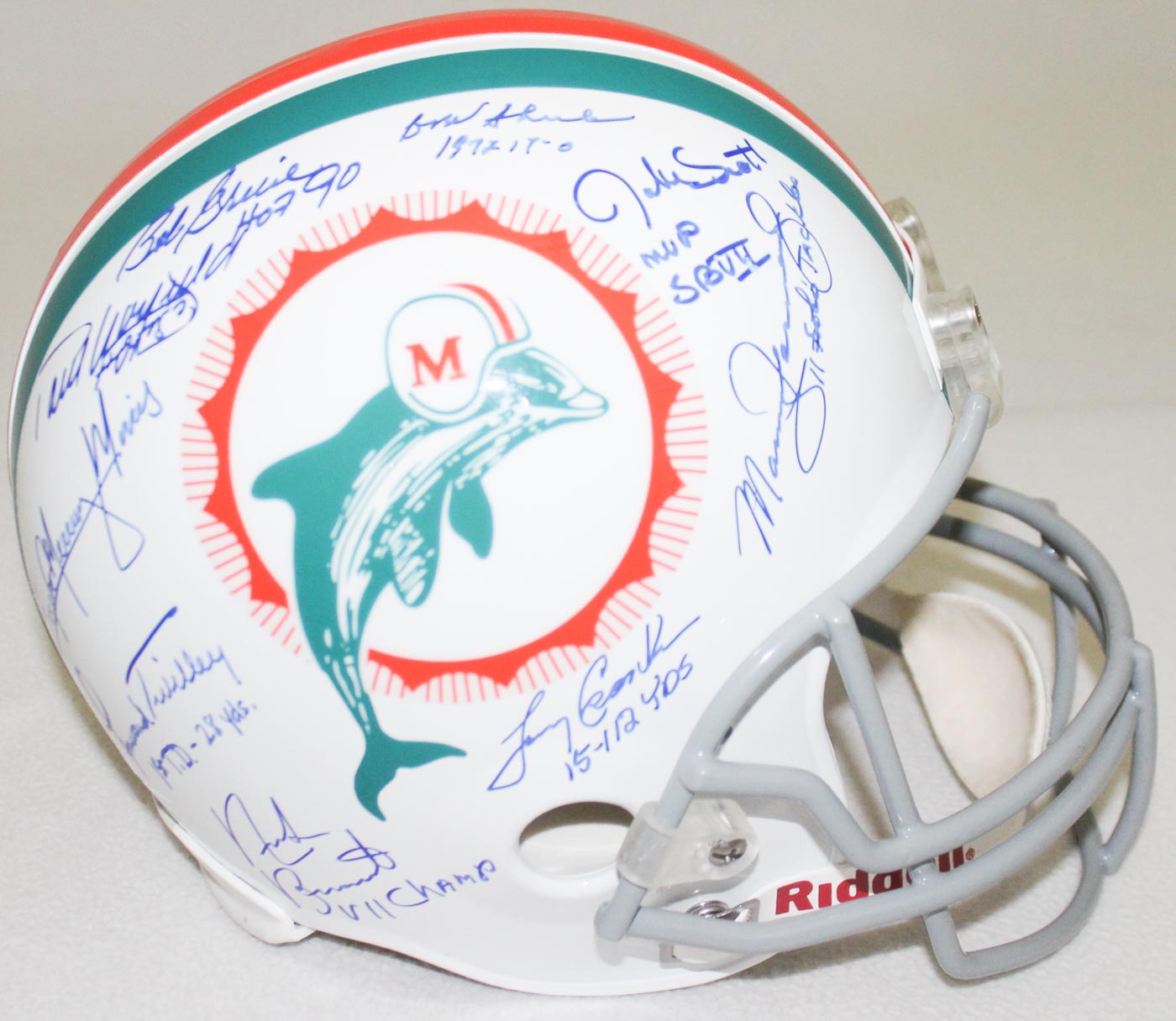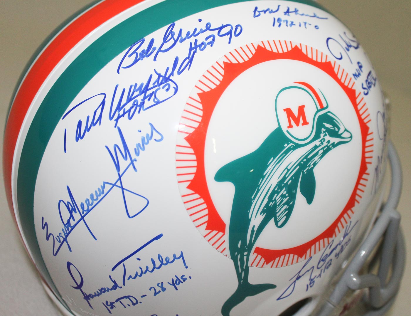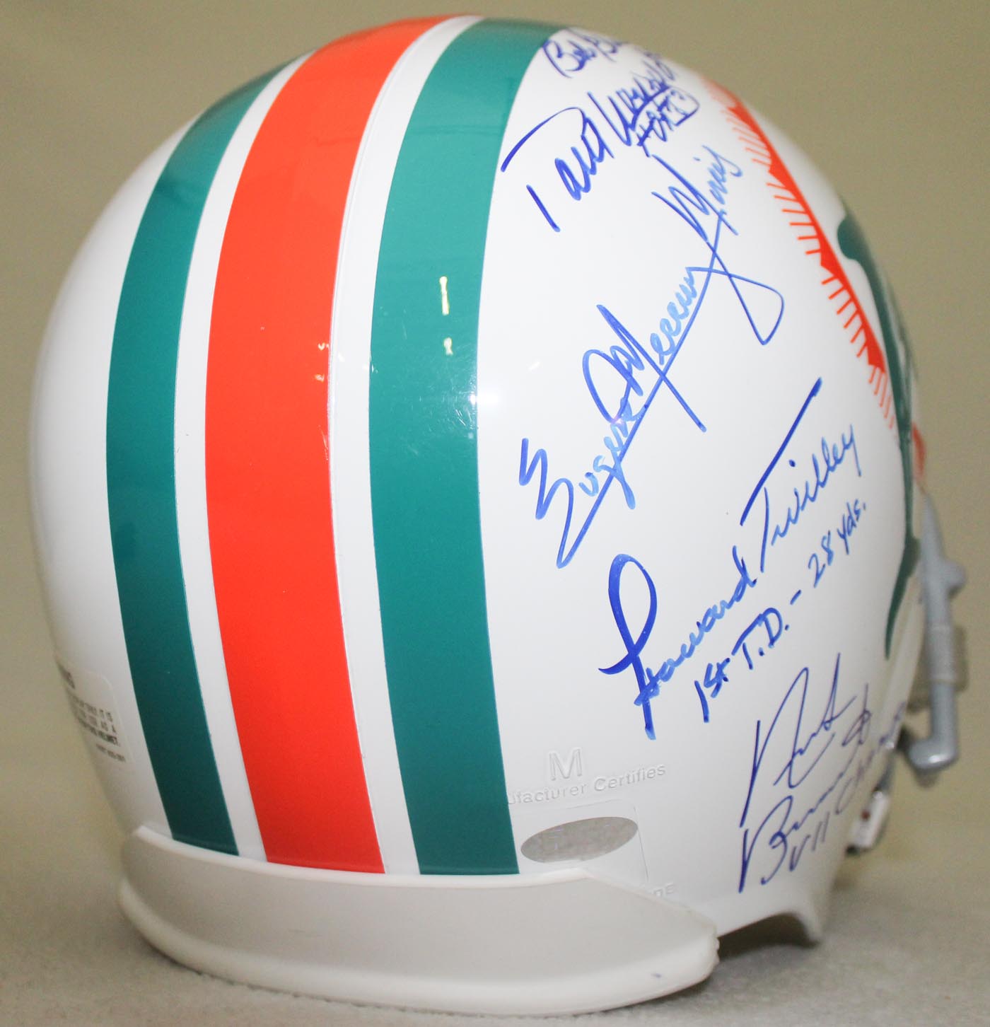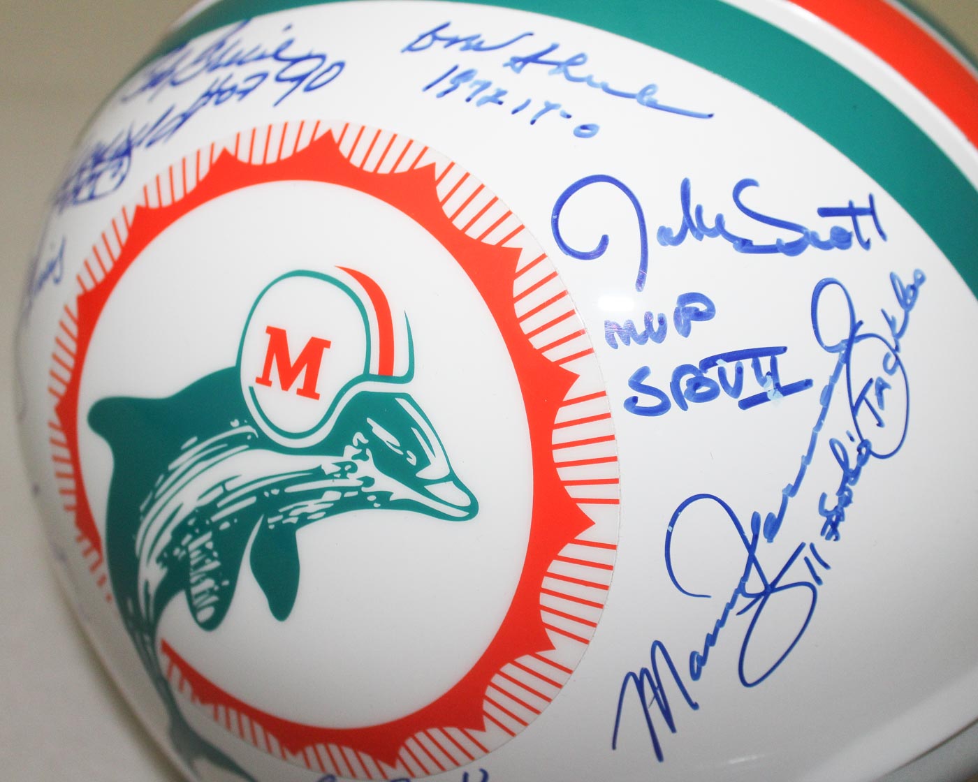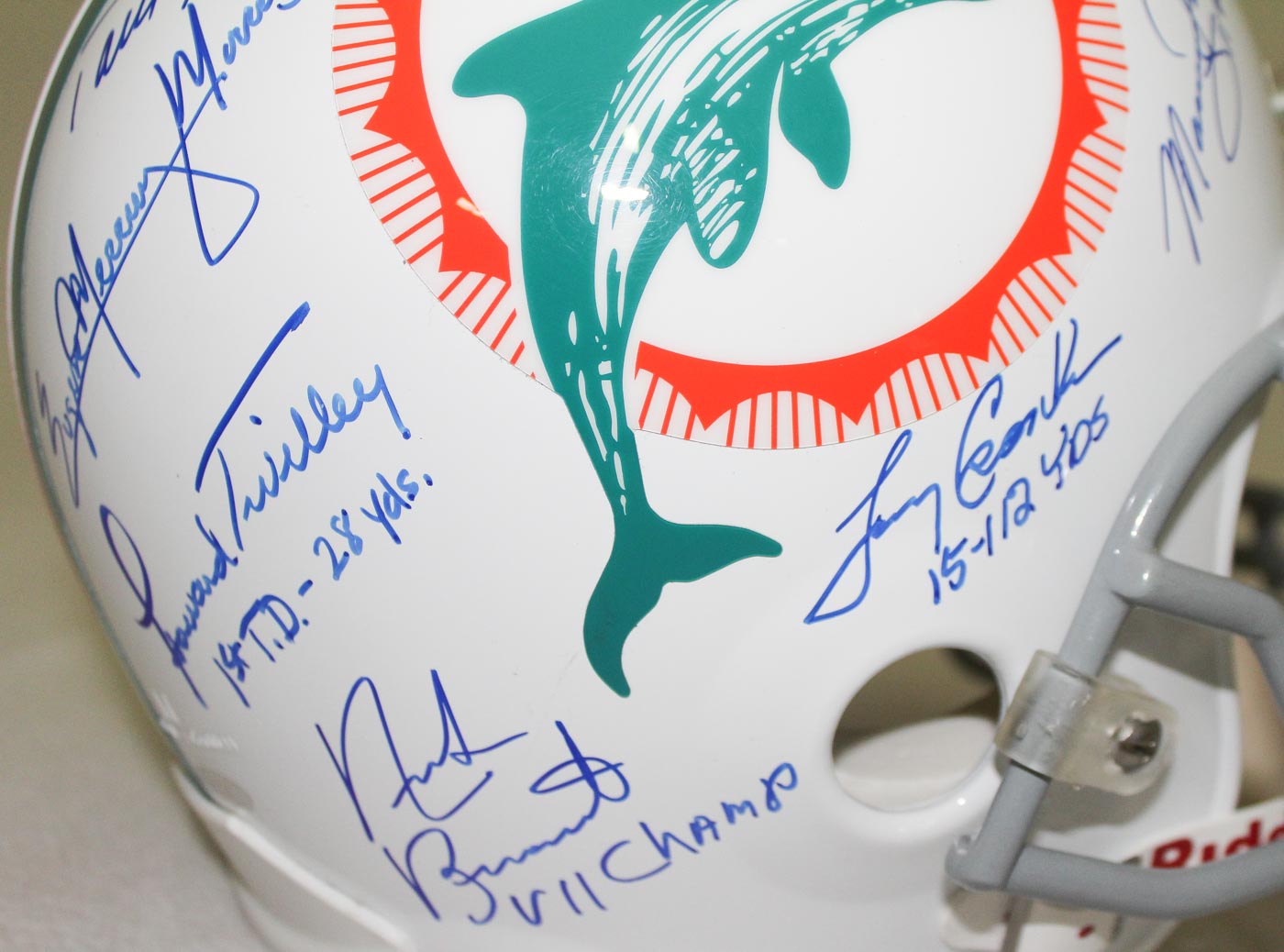 Riddell full-size replica helmet. Hand-signed and inscribed in blue felt-tip pen by Larry Csonka, Jake Scott, Bob Griese (HOF), Mercury Morris, Paul Warfield (HOF), Howard Twilley, Marv Fleming, Nick Buoniconti and Don Shula.