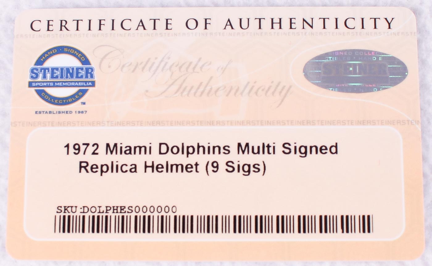Multi-Signed 1972 Miami Dolphins Full-Size Helmet Signed by (9) With Larry Csonka, Jake Scott, Bob Griese, Mercury Morris, Paul Warfield, Howard Twilley, Marv Fleming, Nick Buoniconti & Don Shula (Steiner COA)
