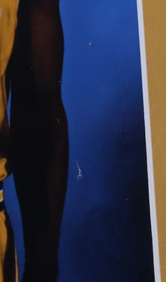 Frame measures 13" x 16" in size and features a photo of the Michigan Wolverines Men's Basketball Team's Fab Five. In the photo is Chris Webber, Jalen Rose, Juwan Howard, Jimmy King, and Ray Jackson. Please note, the frame is showing wear on the sides and there is a small scratch on the glass.