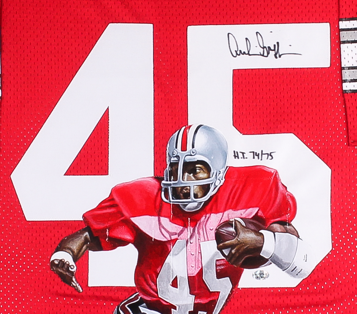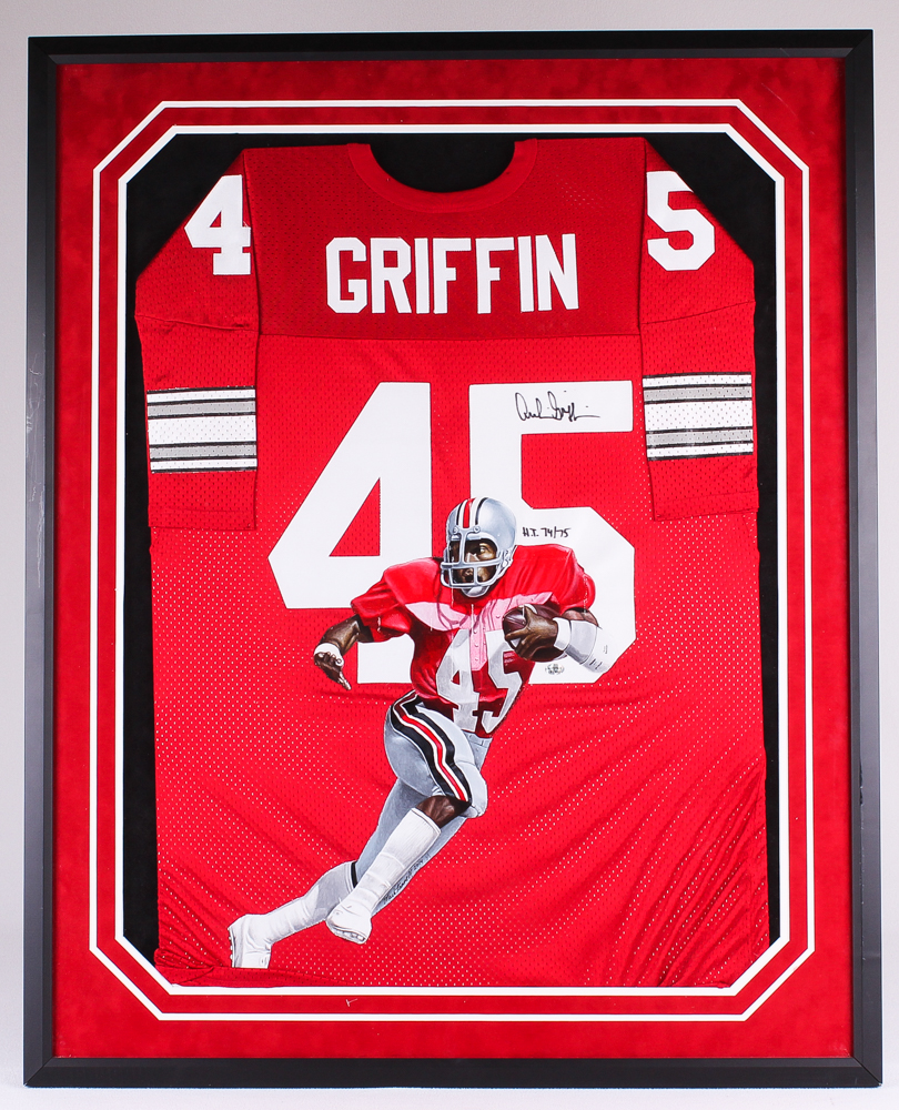 Custom framed display measures 34" x 42" in size and features a custom hand-painted Ohio State Buckeyes jersey that has been hand-signed and inscribed in black felt-tip pen by Archie Griffin (Bengals). Jersey is limited edition and has been hand-numbered #1/1. Jersey has also been hand-signed by the original artist.