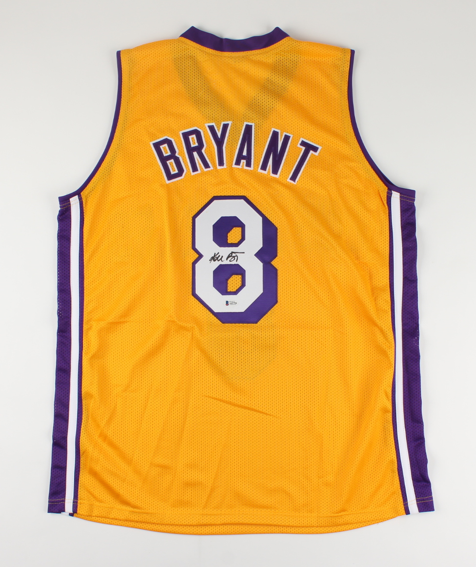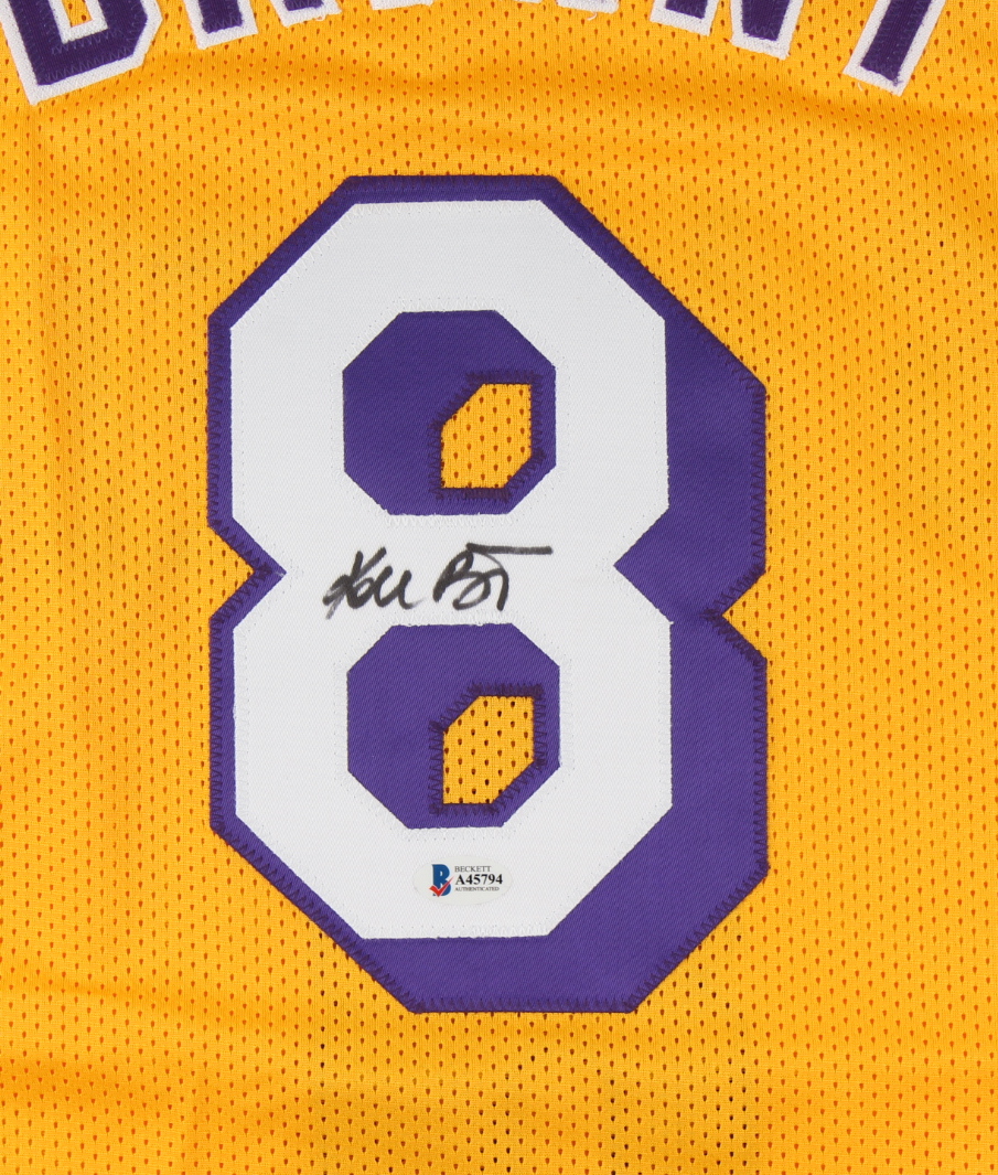 Custom on-court style jersey. Everything is sewn on, size XL. Has been hand-signed by Kobe Bryant (D. 2020, HOF).
