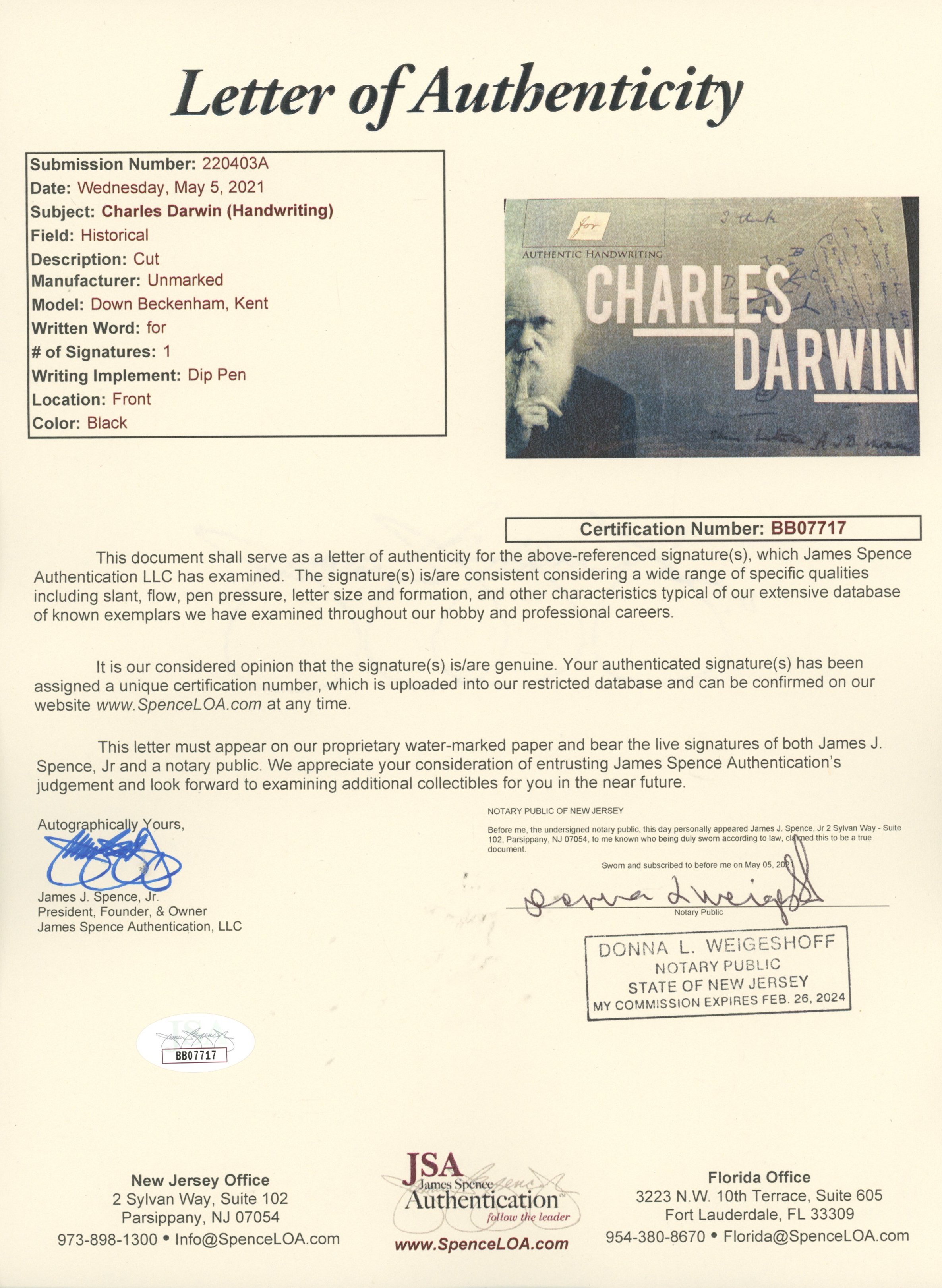 Charles Darwin Hand-Written Word (JSA LOA)