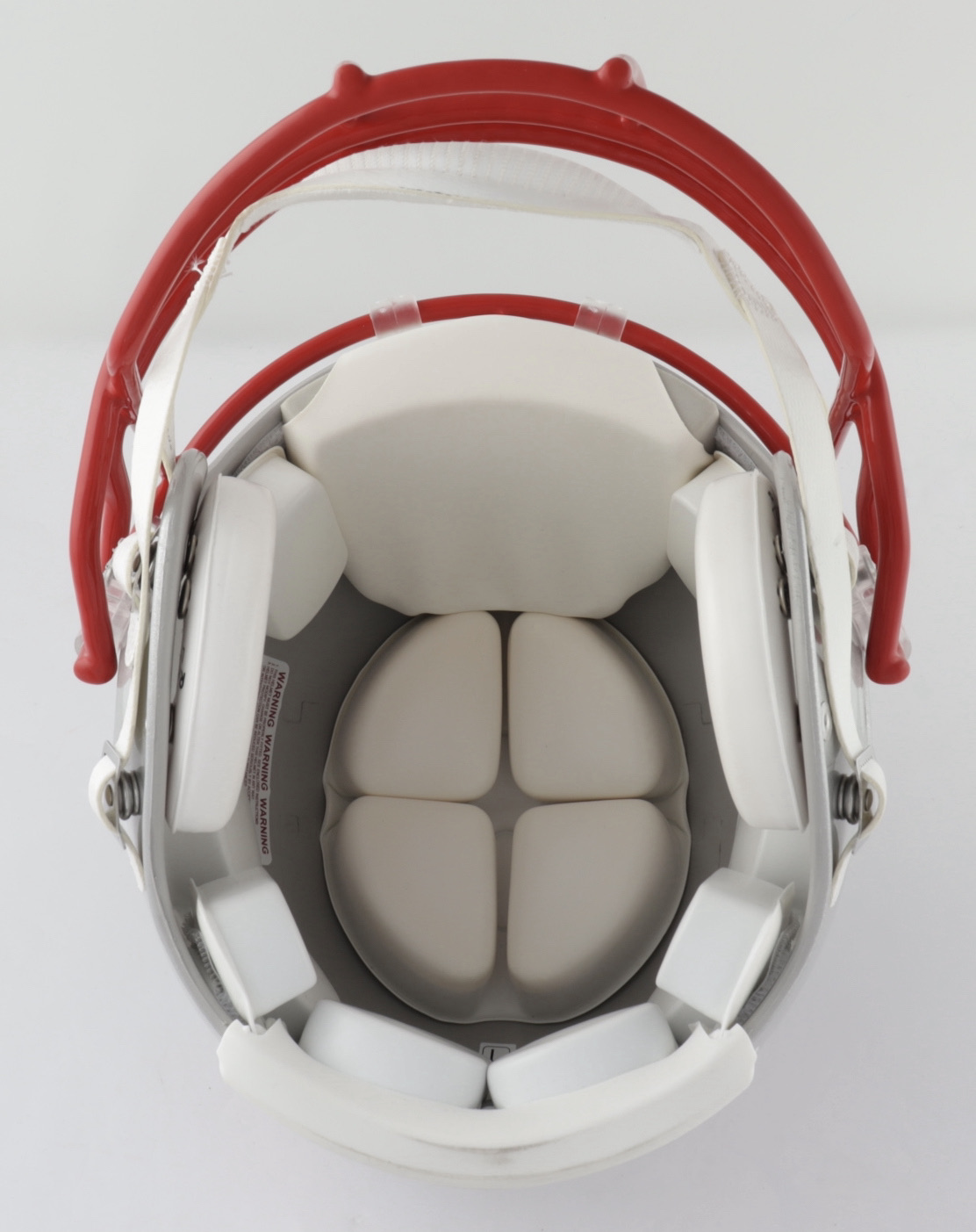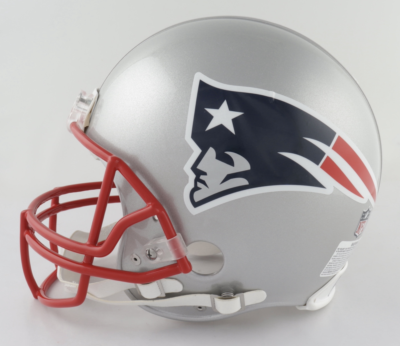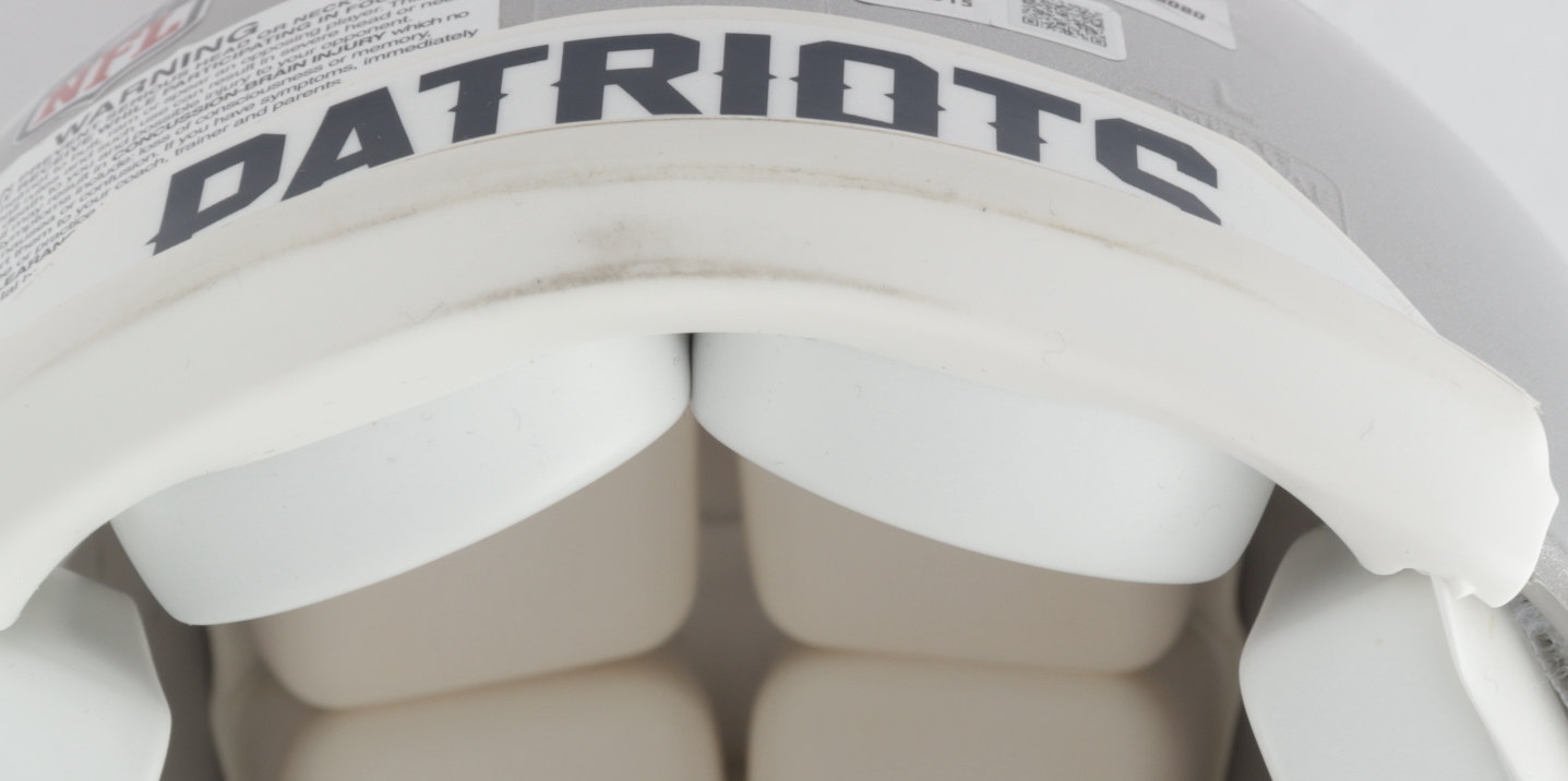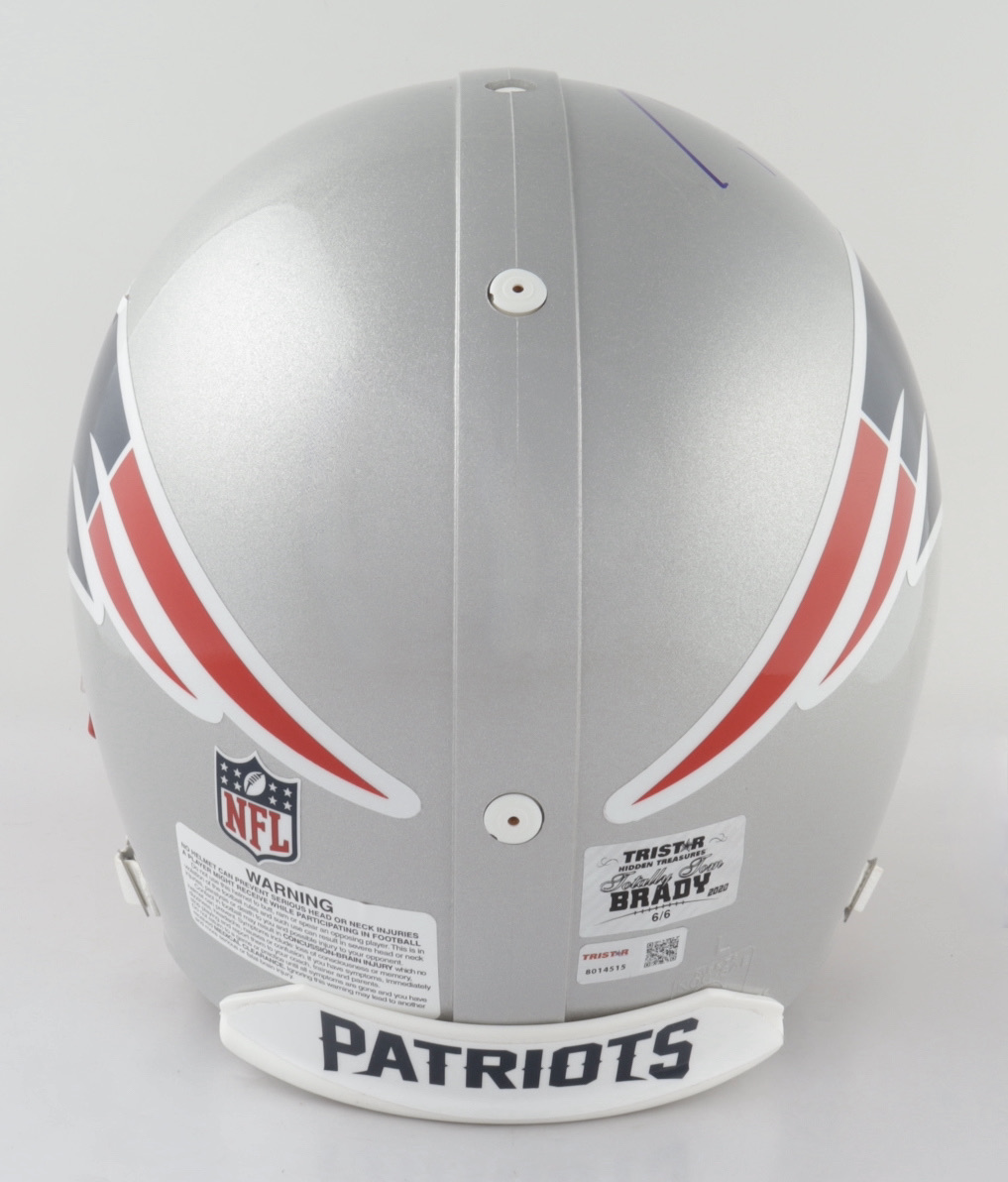 Riddell New England Patriots full-size authentic on-field helmet. Hand-signed and inscribed by Tom Brady. The helmet is limited edition and hand-numbered #6/6. Please note, the left logo sticker has two bubbles, and the bottom of the neck guard has some slight stains.