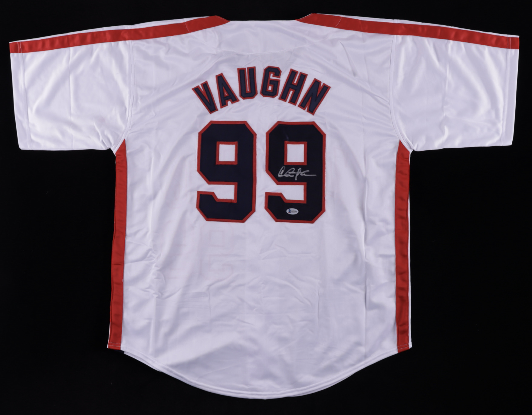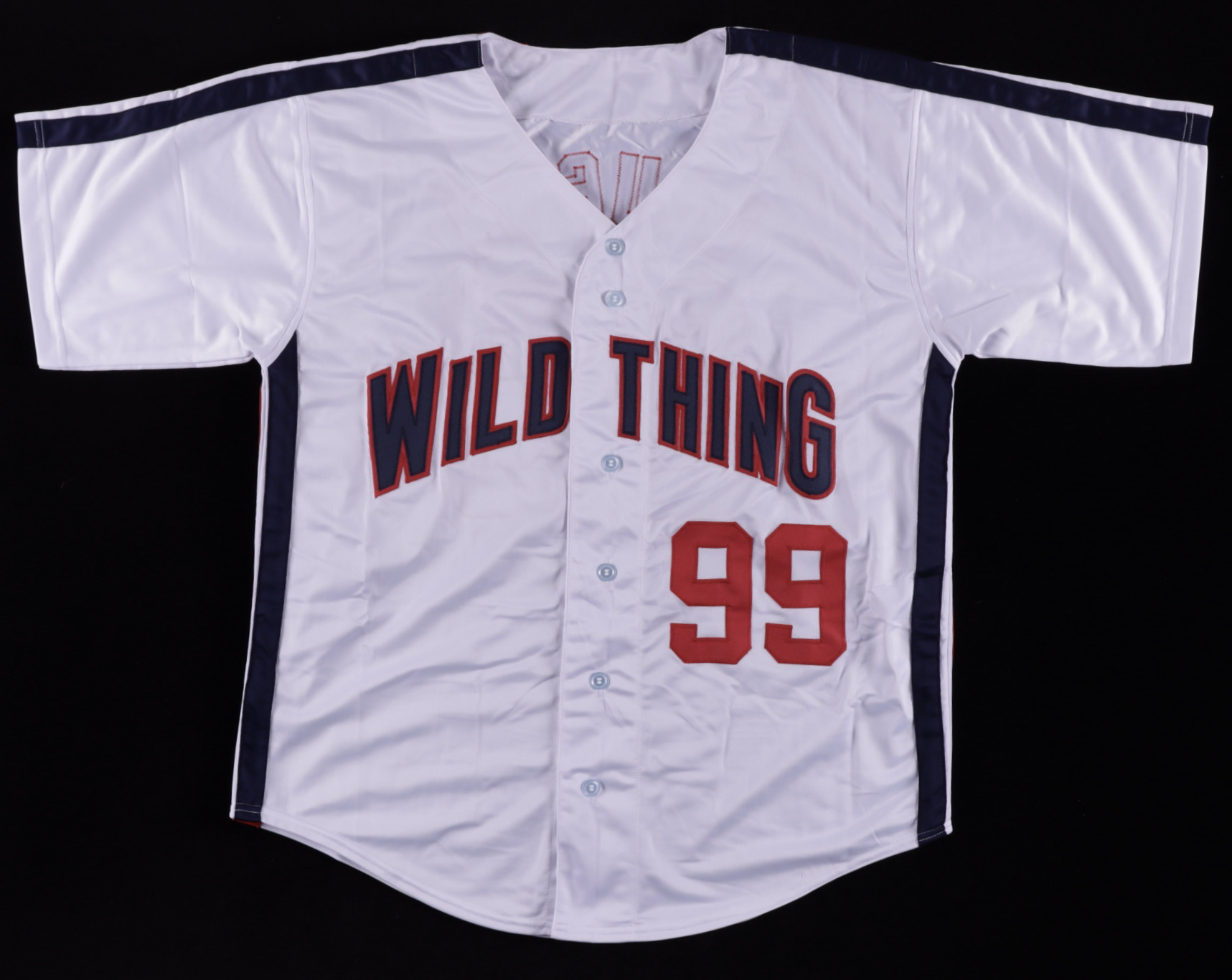 Custom on-field style jersey. Everything is sewn on, size XL. Has been hand-signed by Charlie Sheen (Ricky "Wild Thing" Vaughn).