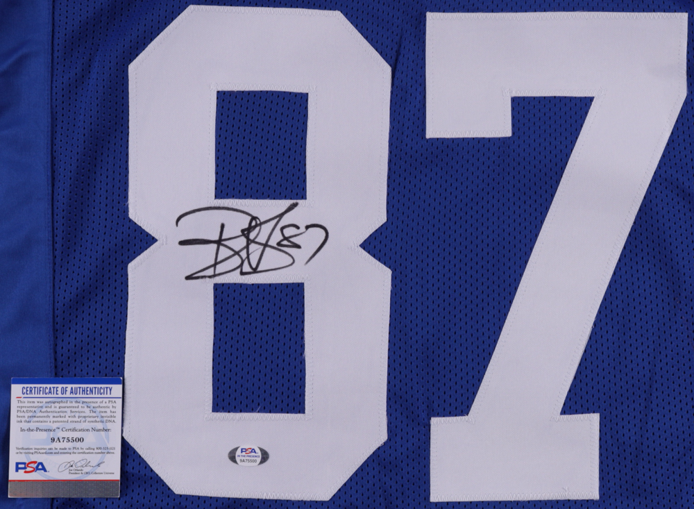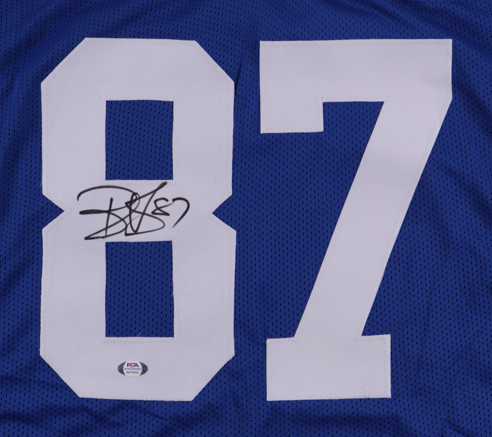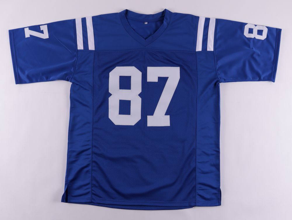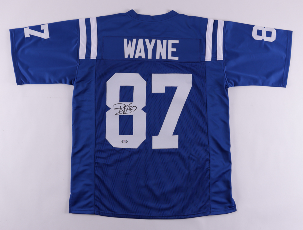 Custom on-field style jersey. Everything is sewn on, size XL. Has been hand-signed by Reggie Wayne.