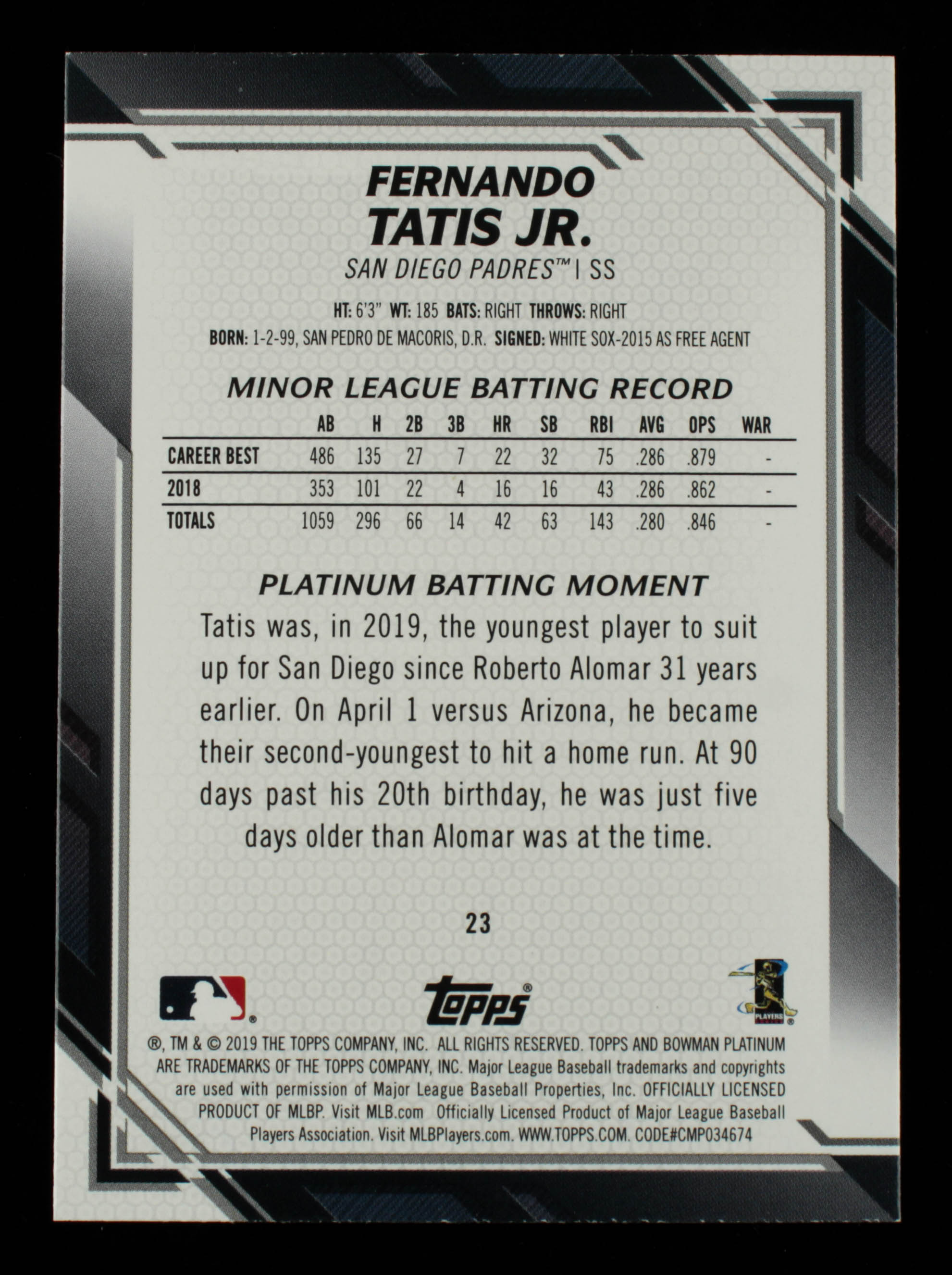 Fernando Tatis Jr 2019 Bowman Platinum Base Set Variations #23 RC