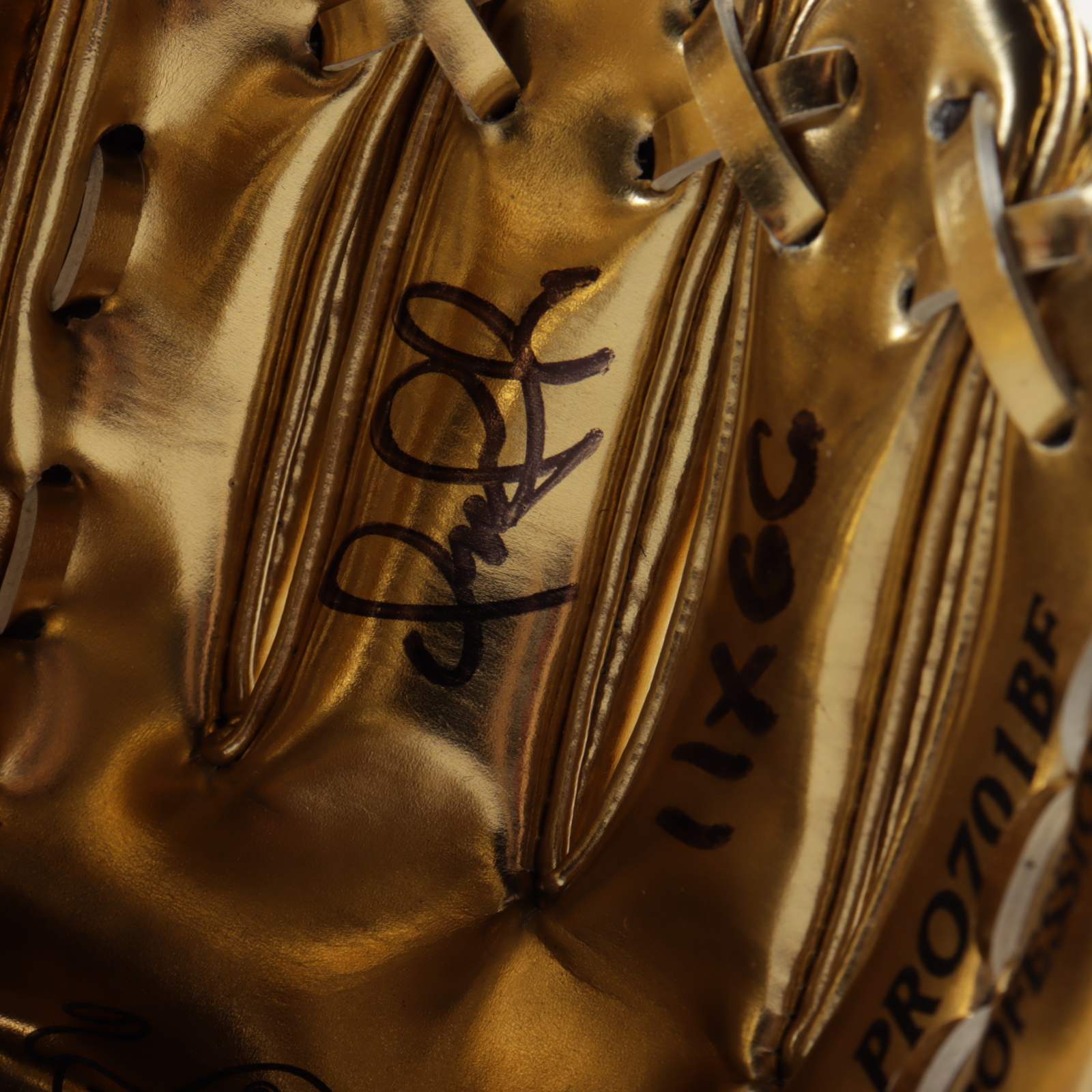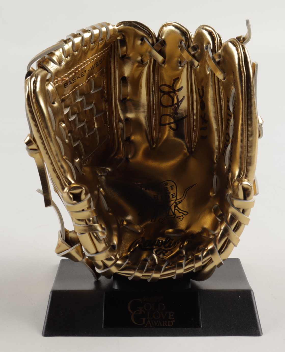 Rawlings mini gold baseball glove. Hand-signed by Omar Vizquel (Cleveland Indians).