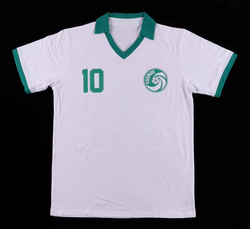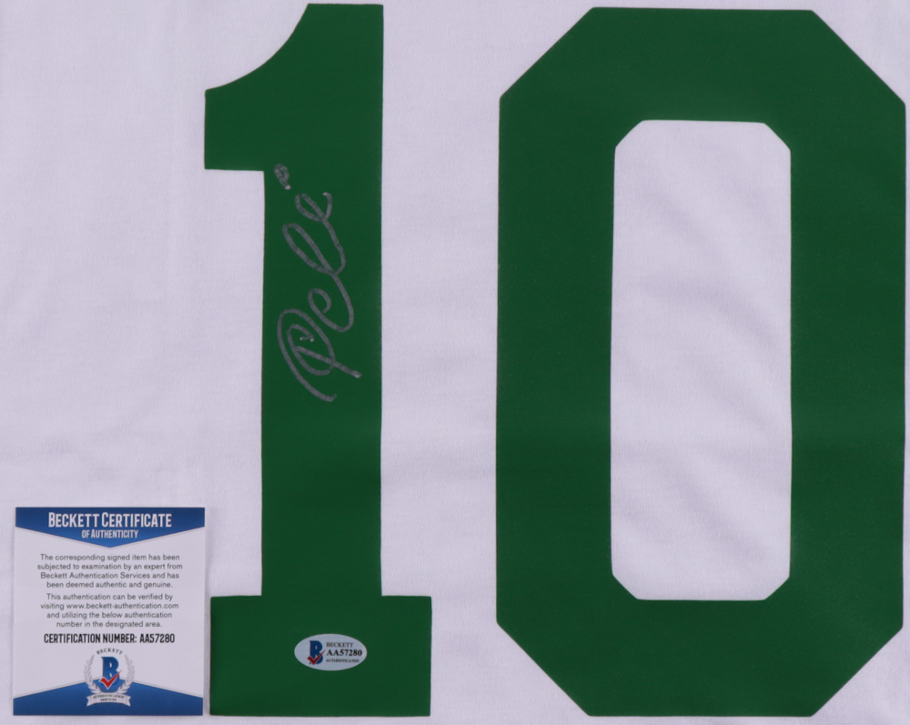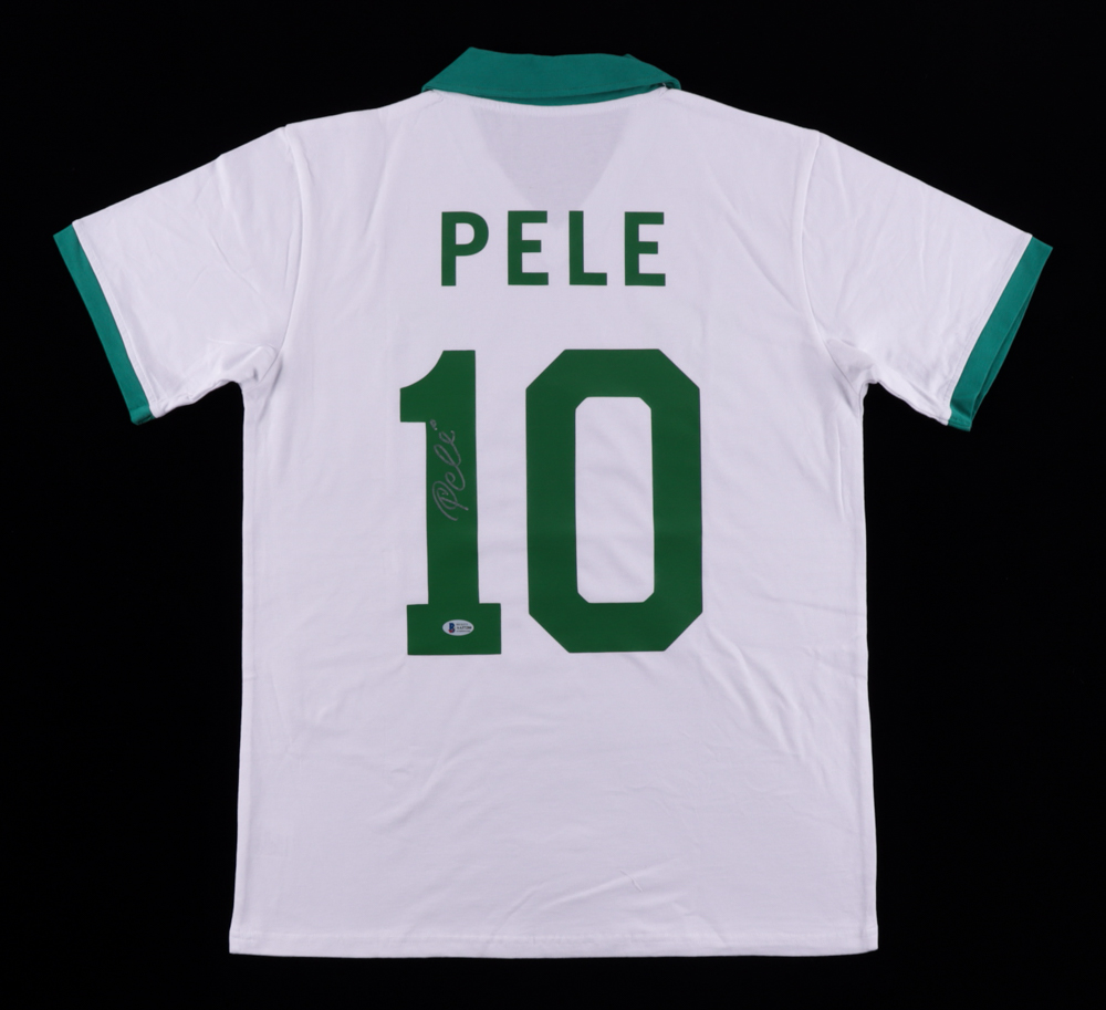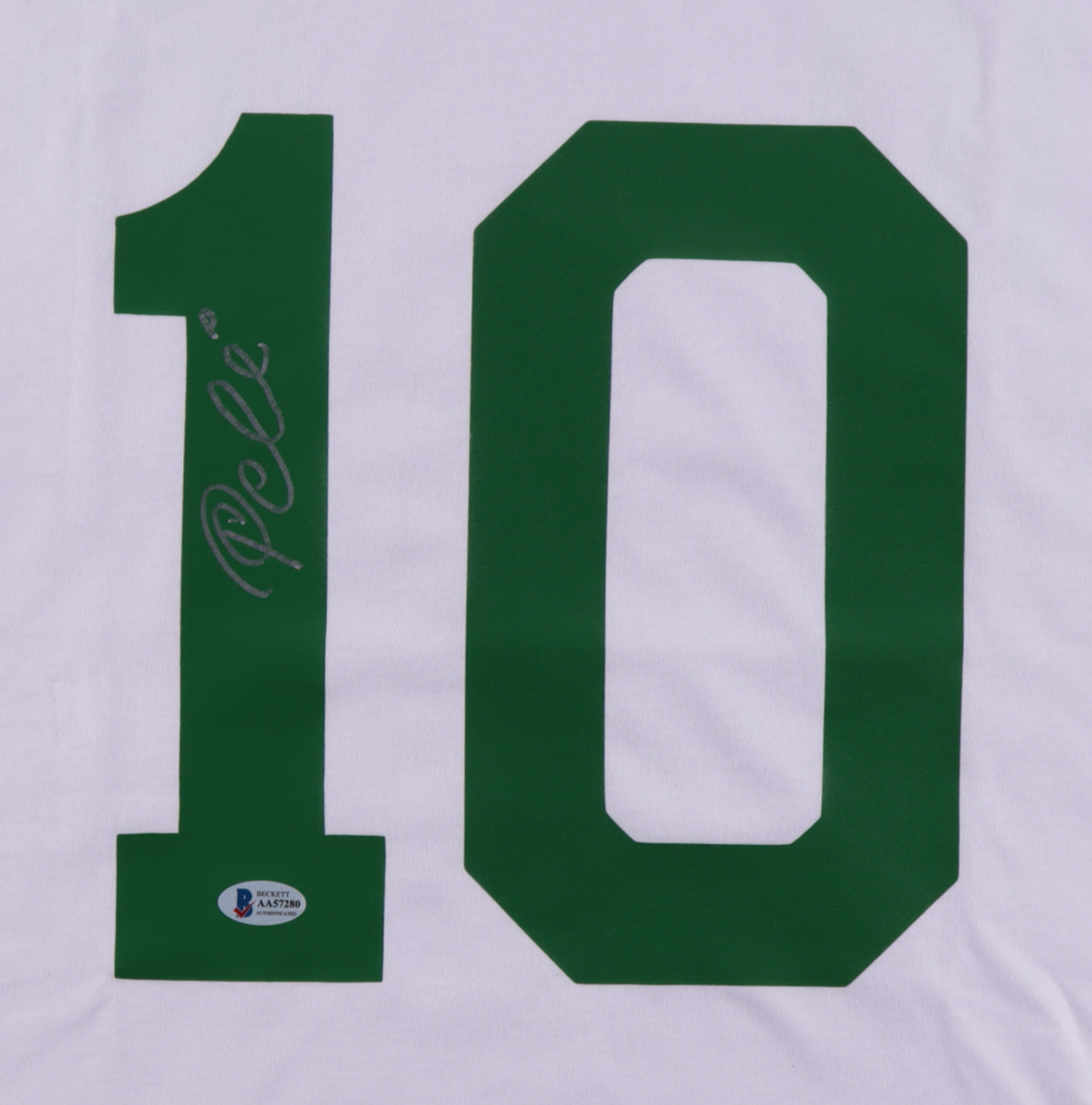 Custom on-field style jersey. Everything is printed on, size XL. Has been hand-signed by Pele (HOF).
