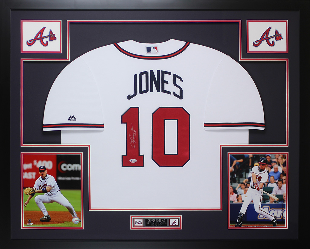 Custom frame measures 35" x 43" in size and features a jersey that has been hand-signed by Chipper Jones (HOF).