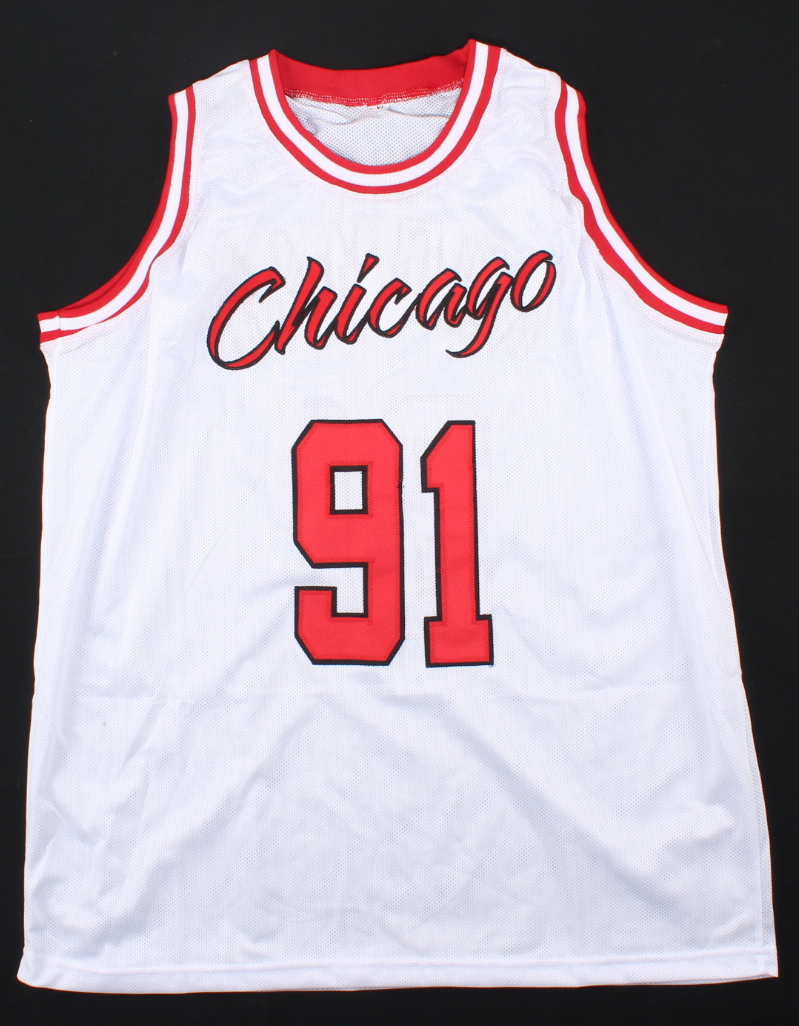 Custom on-court style jersey. Everything is sewn on, size XL. Hand-signed by Dennis Rodman (HOF).