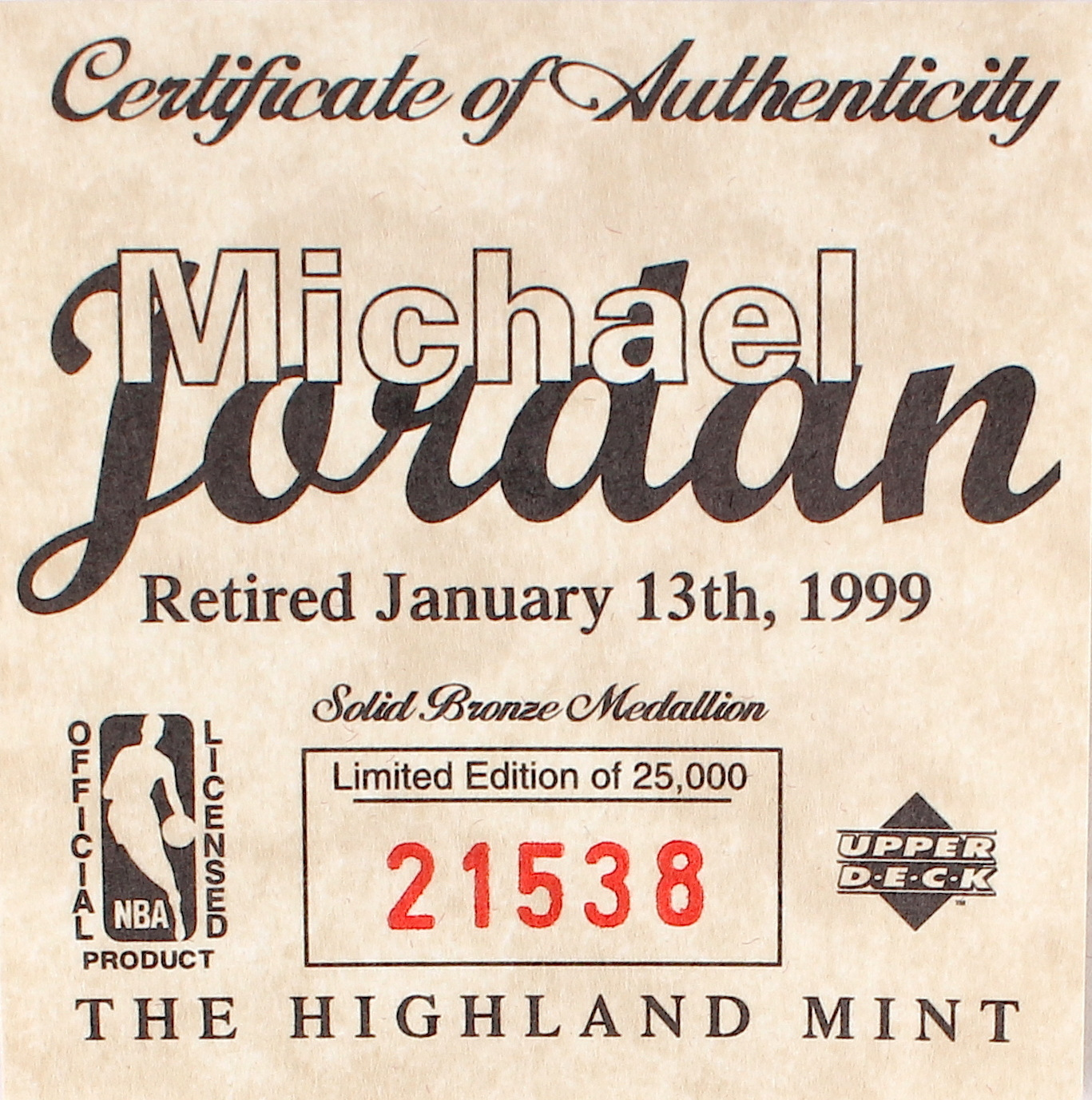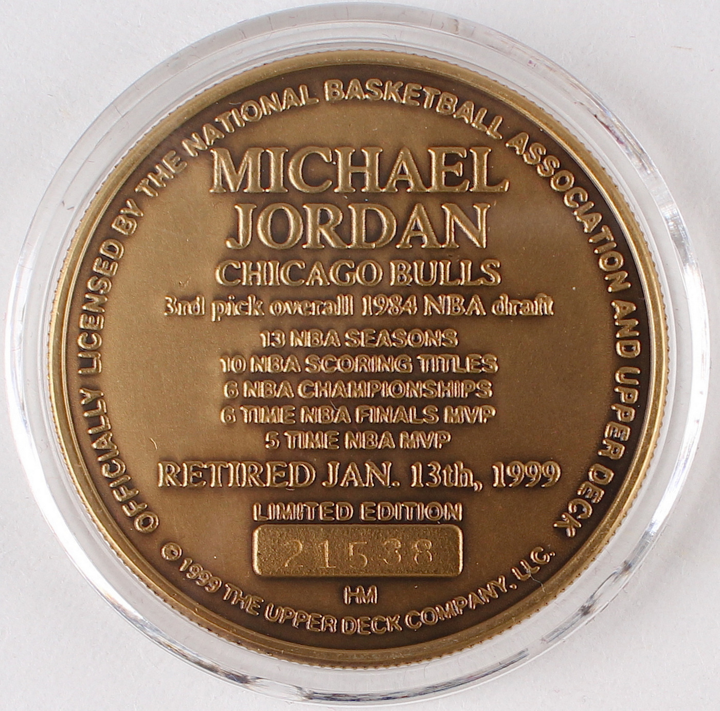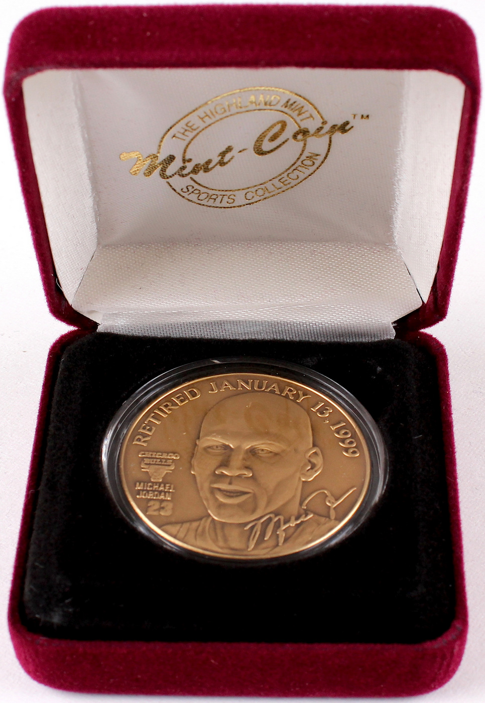 Limited edition Michael Jordan bronze coin includes case along with COA. Produced by Highland Mint. Please note, you are bidding on a random edition number. Images shown are stock photos from the same edition run.