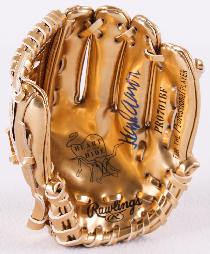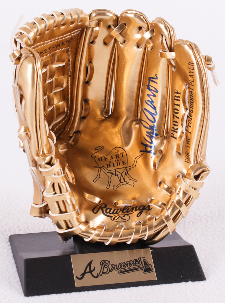 Rawlings "The Gold Glove Co." mini baseball glove. The glove measures roughly 6" long. Hand-signed on the inside of the glove in blue felt tip pen by Hank Aaron (Braves HOF). Includes the display stand as shown in photos.