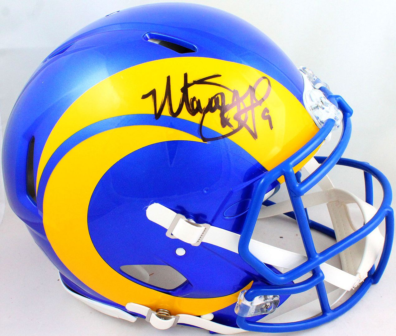 Riddell Los Angeles Rams full-size authentic on-field speed helmet has been hand-signed by Matthew Stafford.