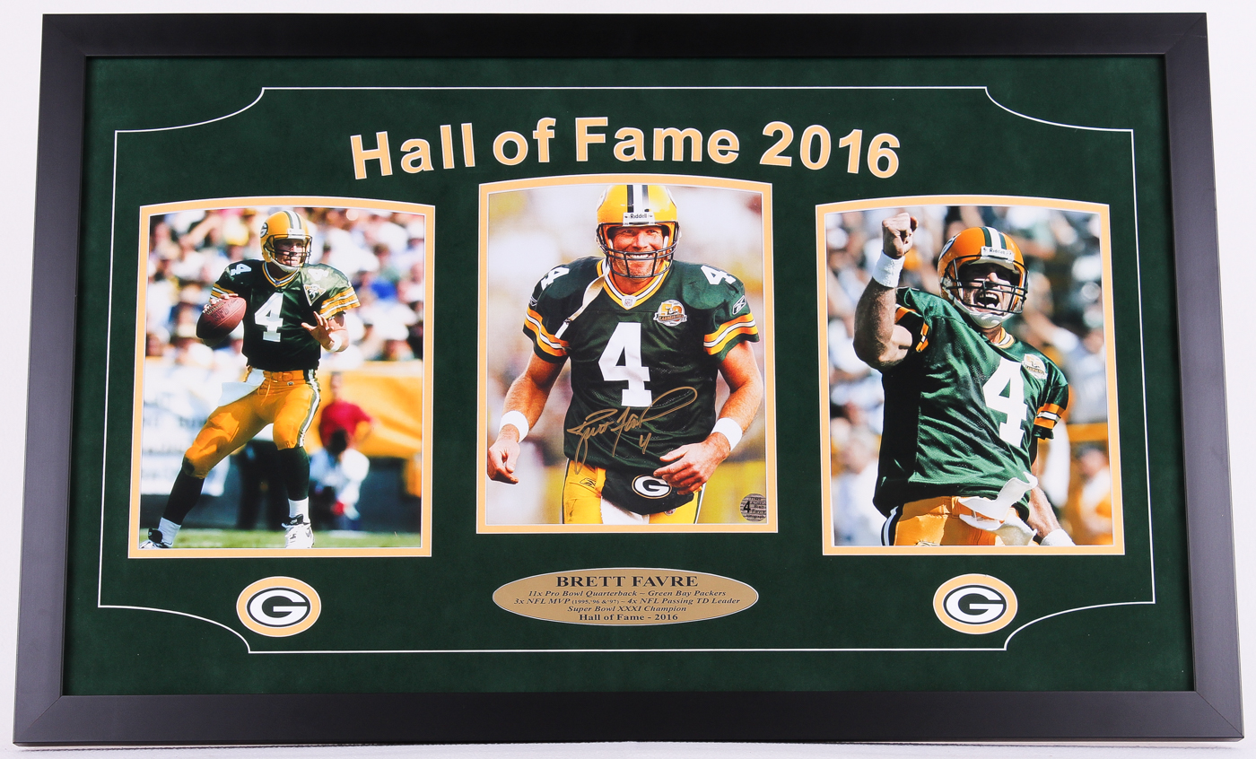 Custom framed display measures 21.25" x 33.25" and features (3) 8" x 10" photos of Brett Favre. (1) photo has been hand signed in gold paint pen by Brett Favre (Packers HOF).