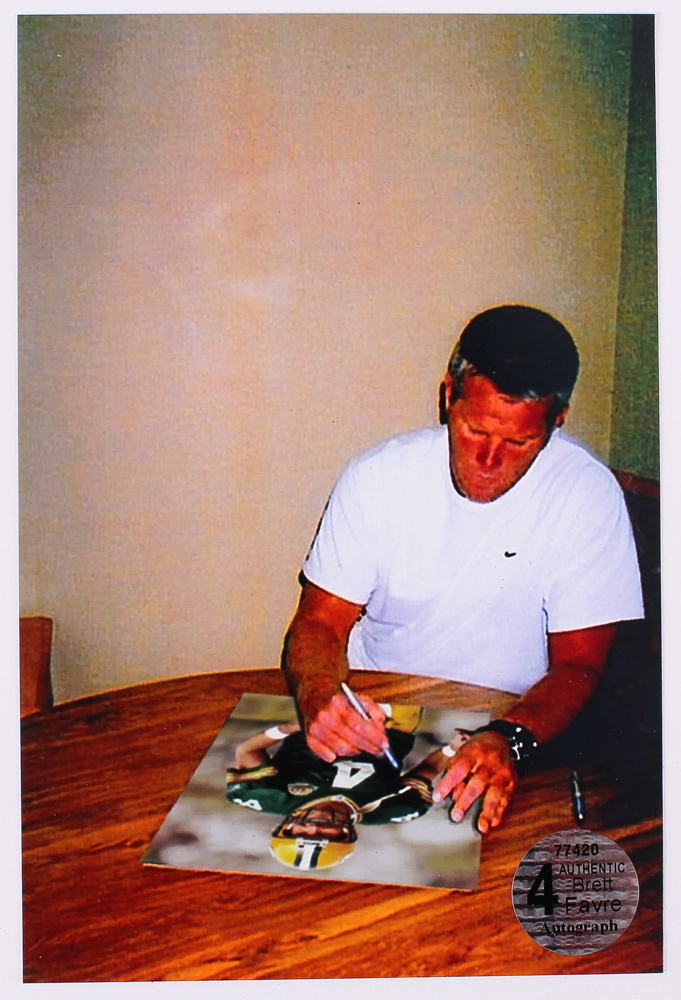 The autograph includes a Brett Favre hologram and matching COA for authenticity purposes. Includes a proof picture of the signing.