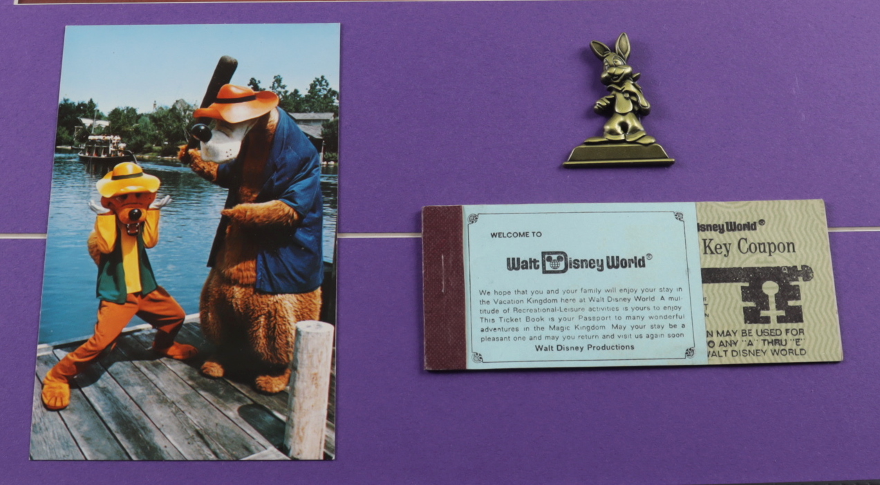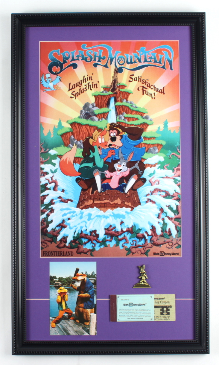 Custom framed measuring 15" x 26" "Splash Mountain" print with a vintage Disney World ticket book, a souvenir postcard, and a retired Br'er Rabbit lapel pin. Please note, the glass has a scuff mark.