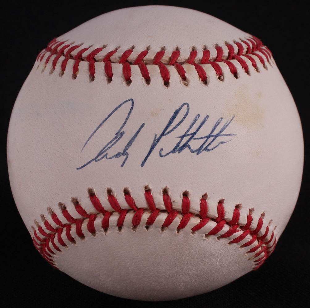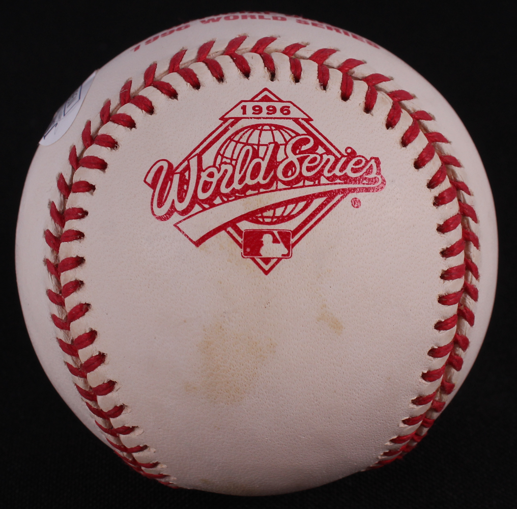 Official 1996 World Series Baseball. Hand-signed in blue ink pen by Andy Pettitte (Yankees).