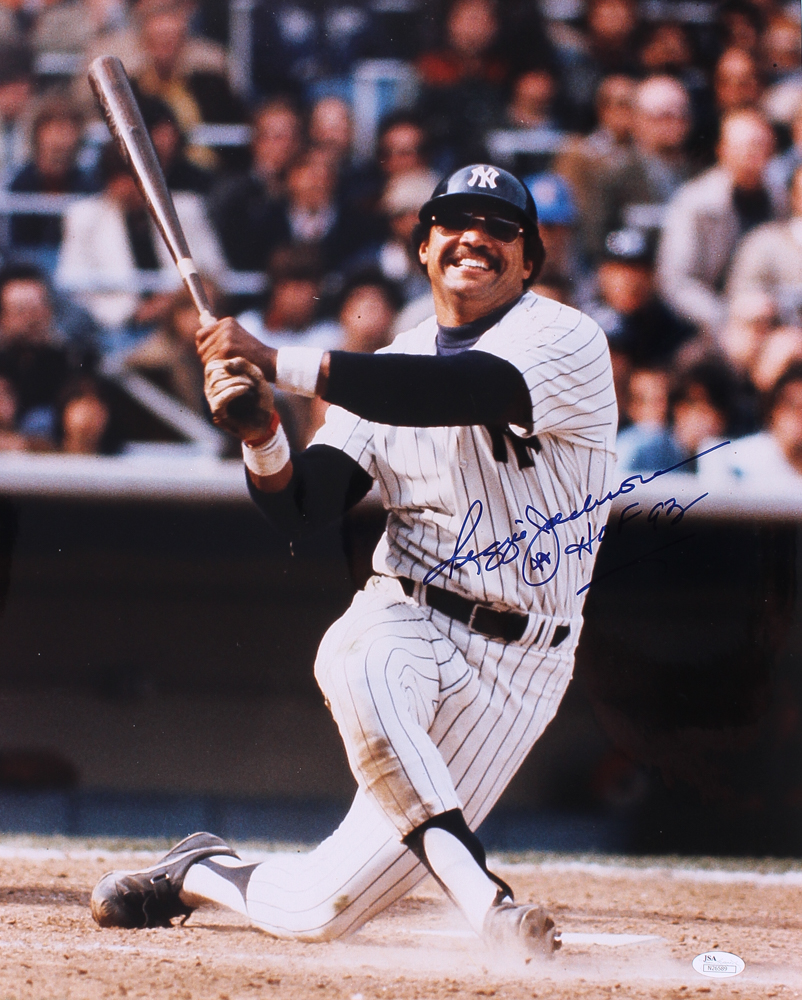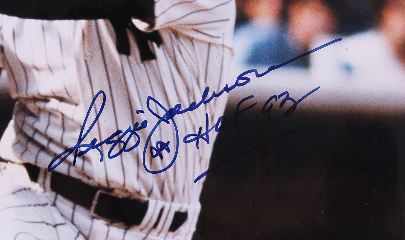 Photo measures 16" x 20" in size and has been hand-signed in blue felt tip pen by Reggie Jackson (HOF).