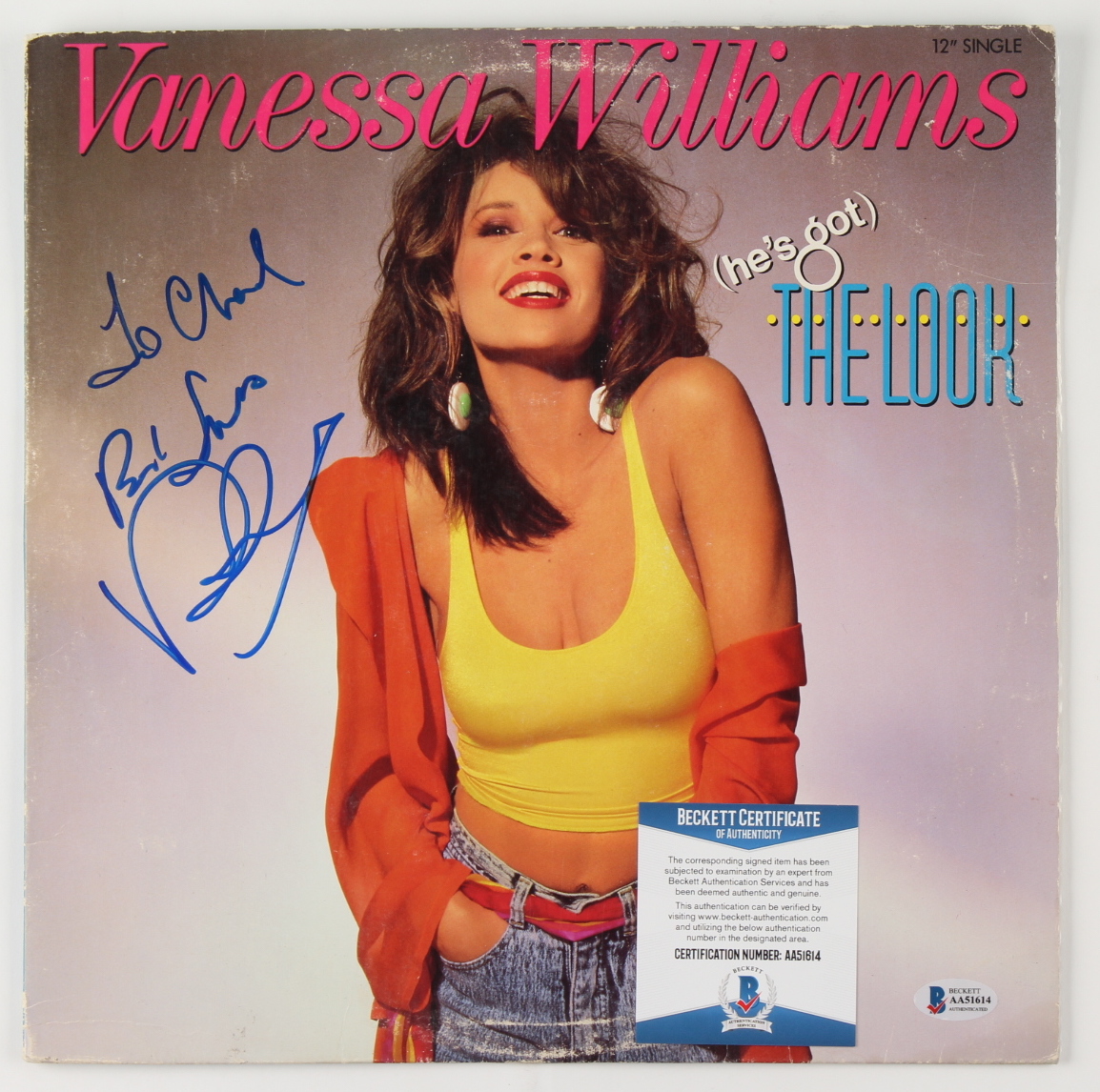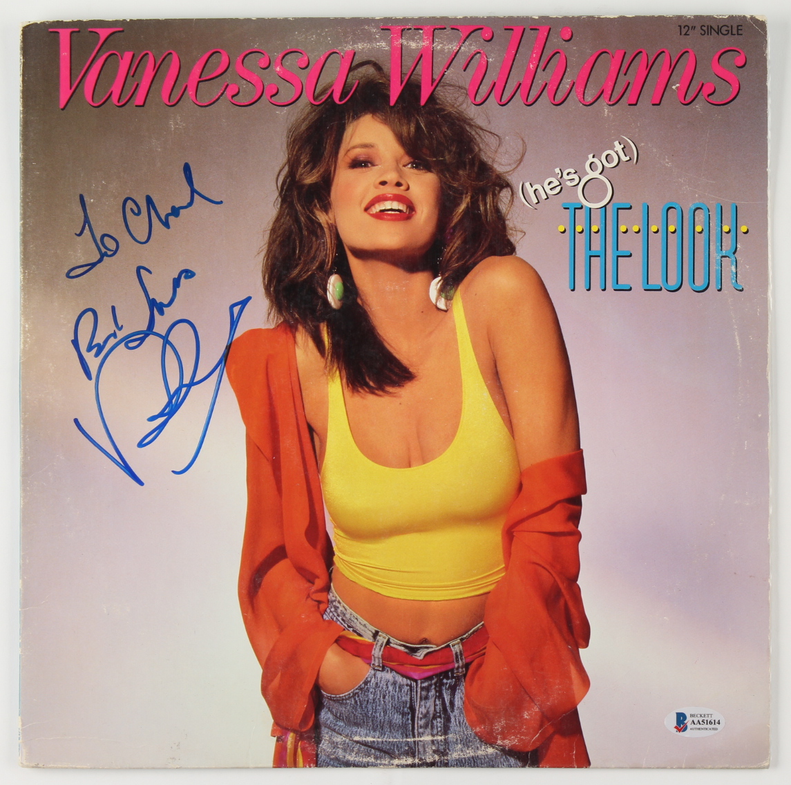 "He's Got The Look" vinyl record album cover has been hand-signed on the cover by Vanessa Williams. Please note that the vinyl record is included. Please note, the record has been personalized, "To Chad."