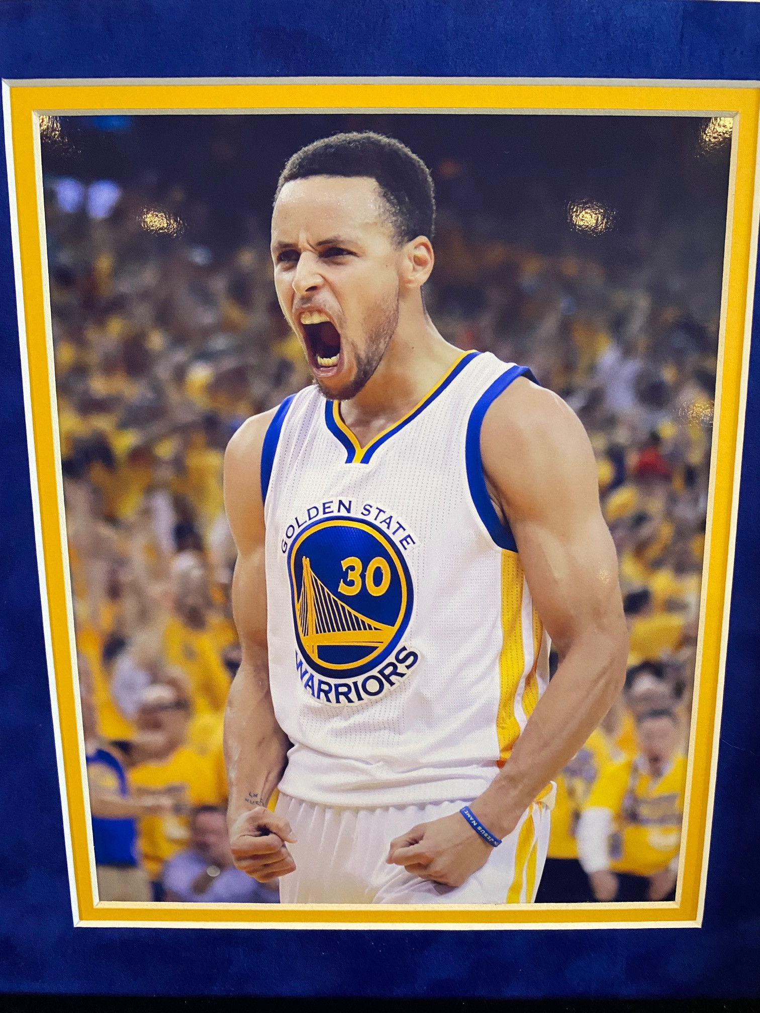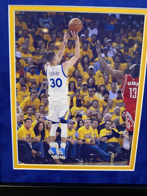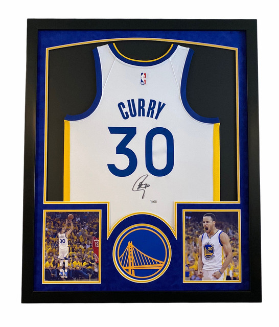 Custom frame measures 33" x 40" in size and features a jersey that has been hand-signed by Stephen Curry (Golden State Warriors). THE FRAMING Team Color Suede Matting 8x10 Professional Photos Team Logo Black Satin Frame Size: 40”H x 33”W UV Protected Framers Acrylic Ready to Hang