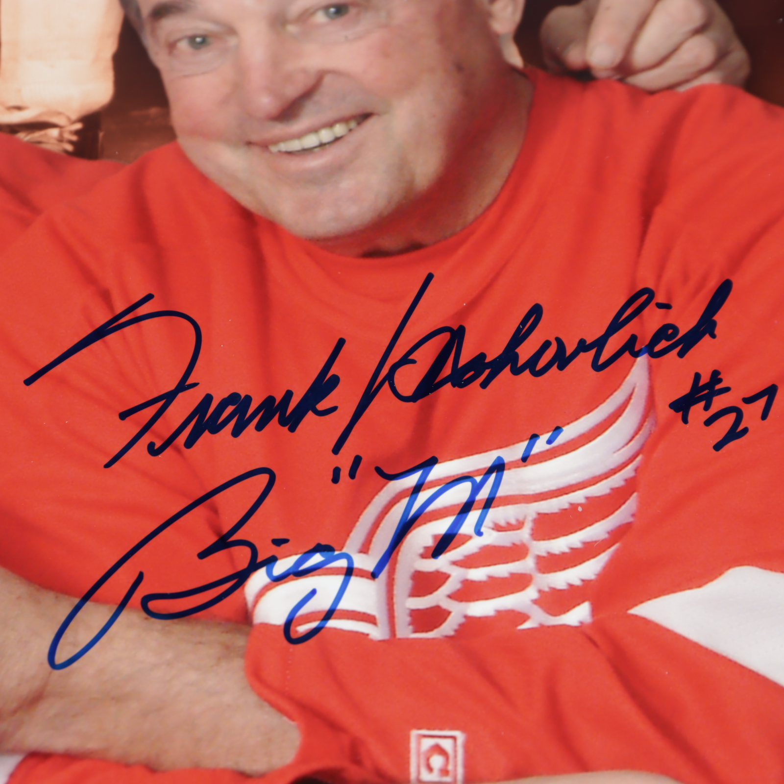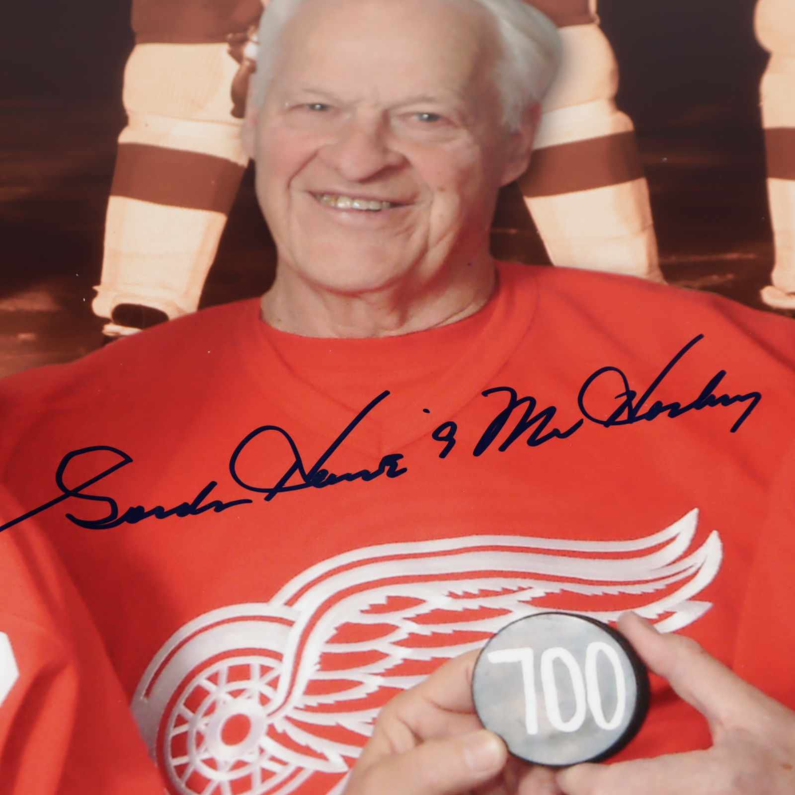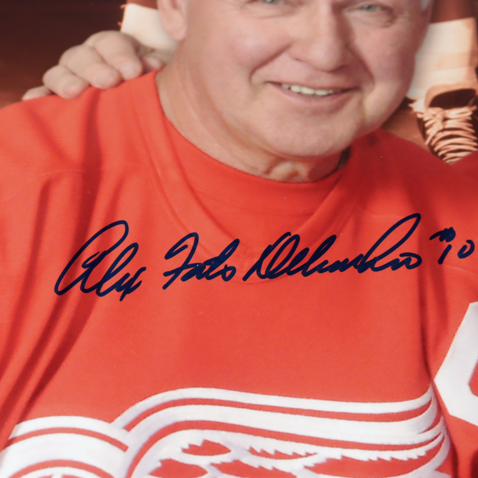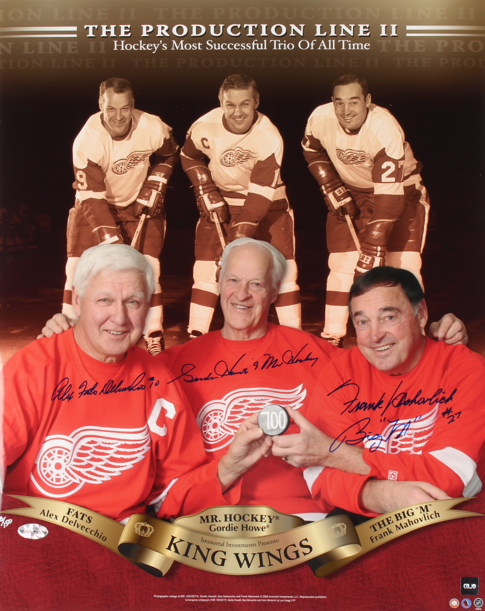 Photo measures 16" x 20" in size and has been hand-signed by Alex Delvecchio (HOF), Gordie Howe (D. 2016, HOF), and Frank Mahovlich (HOF). (Detroit Red Wings)