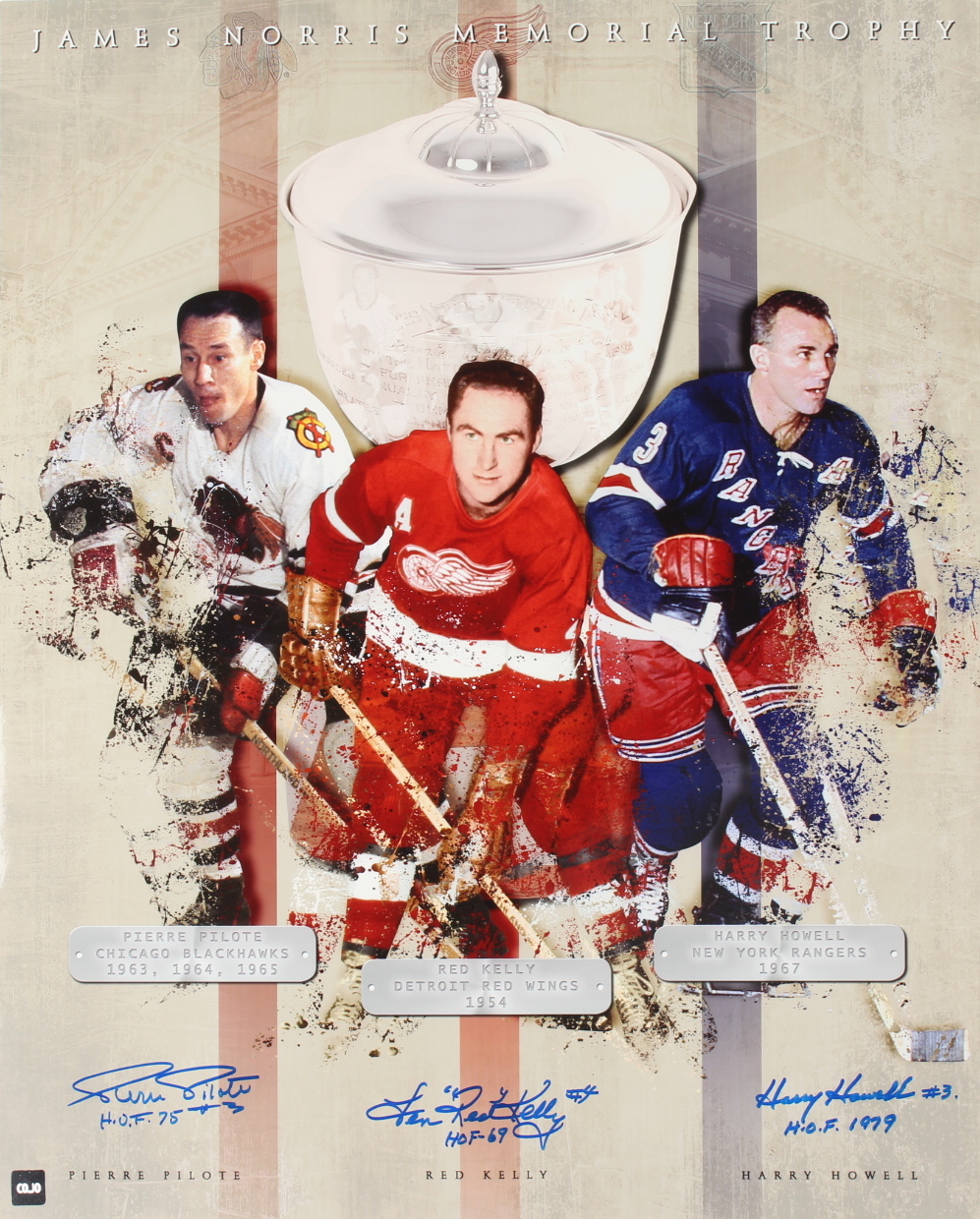 Pierre Pilote, Red Kelly & Harry Howell Signed "James Morris Memorial Trophy" 16x20 Photo With HOF Insriptions (COJO)