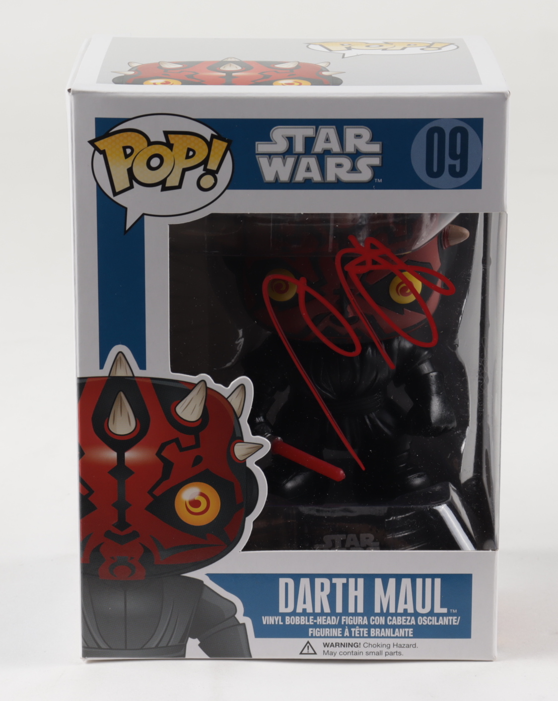 Funko Pop! figure measures approximately 4" tall and has been hand-signed on the packaging by Ray Park (Darth Maul).
