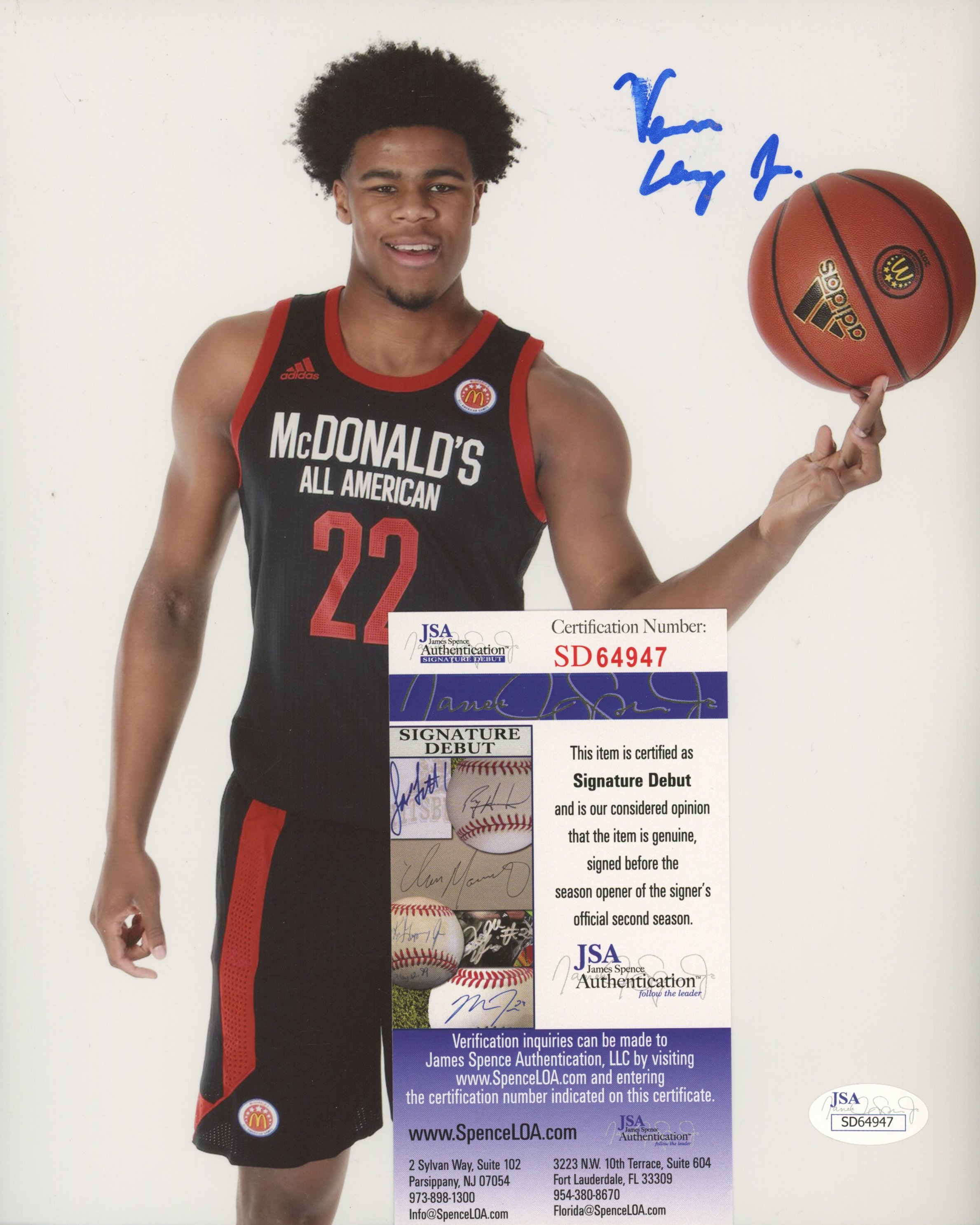 The autograph(s) includes an official James Spence Authentication (JSA) "Signature Debut" hologram and COA. "Signature Debut" is the autographed memorabilia equivalent to a rookie card. The JSA definition of a "Signature Debut" is as follows: "Any item that is autographed and received by JSA prior to the last game of the signer's official rookie season.