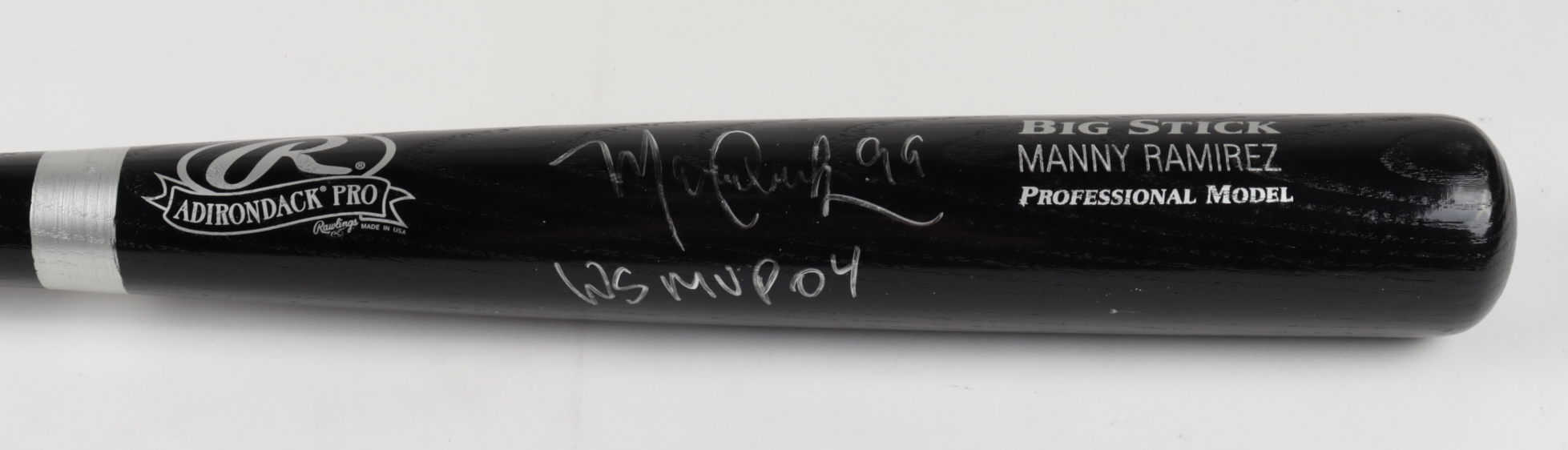 Rawlings Big Stick Player Model baseball bat has been hand-signed by Manny Ramirez (Boston Red Sox). Please note, bat has denting and residue on handle.