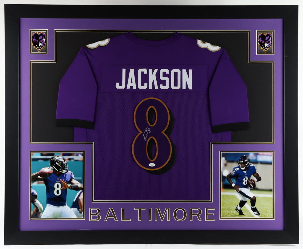 Custom frame measures 35" x 43" in size and features a custom on-field style jersey that has been hand-signed by Lamar Jackson. Please note, there is a small chip on the right edge of the frame.