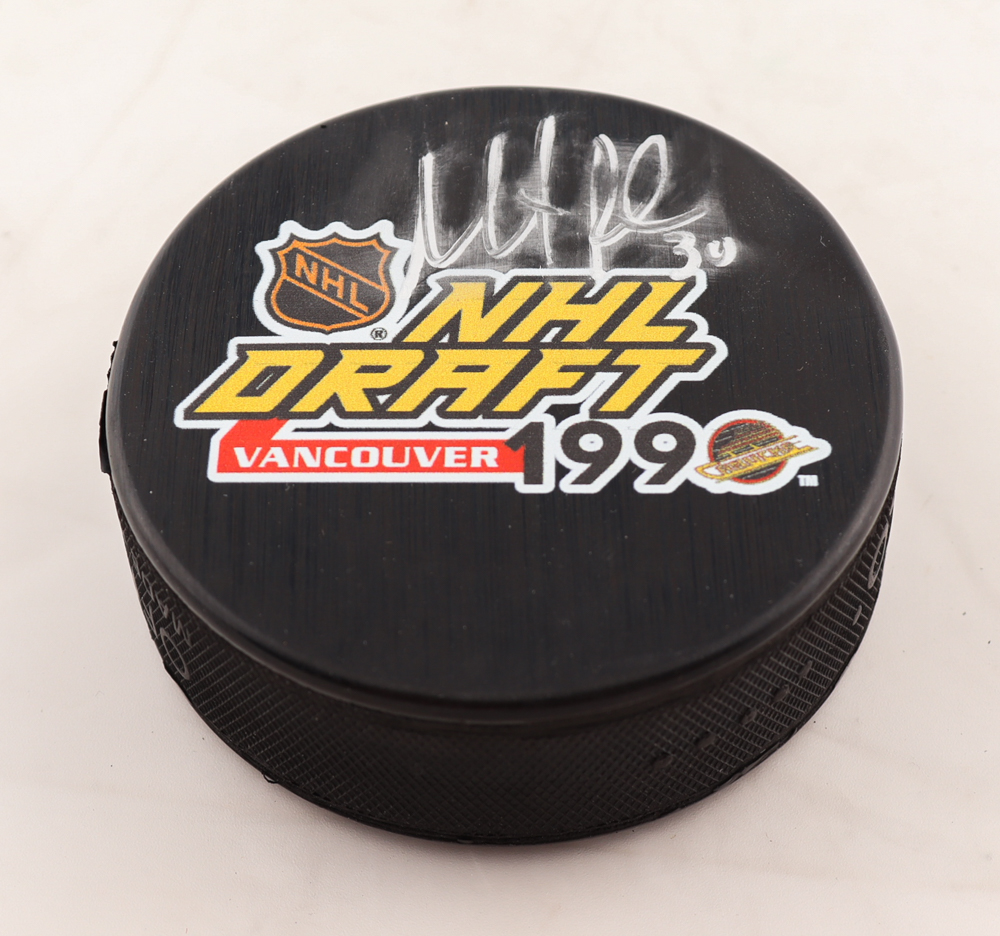 Martin Brodeur Signed 1990 NHL Draft Logo Hockey Puck (Fanatics Hologram)