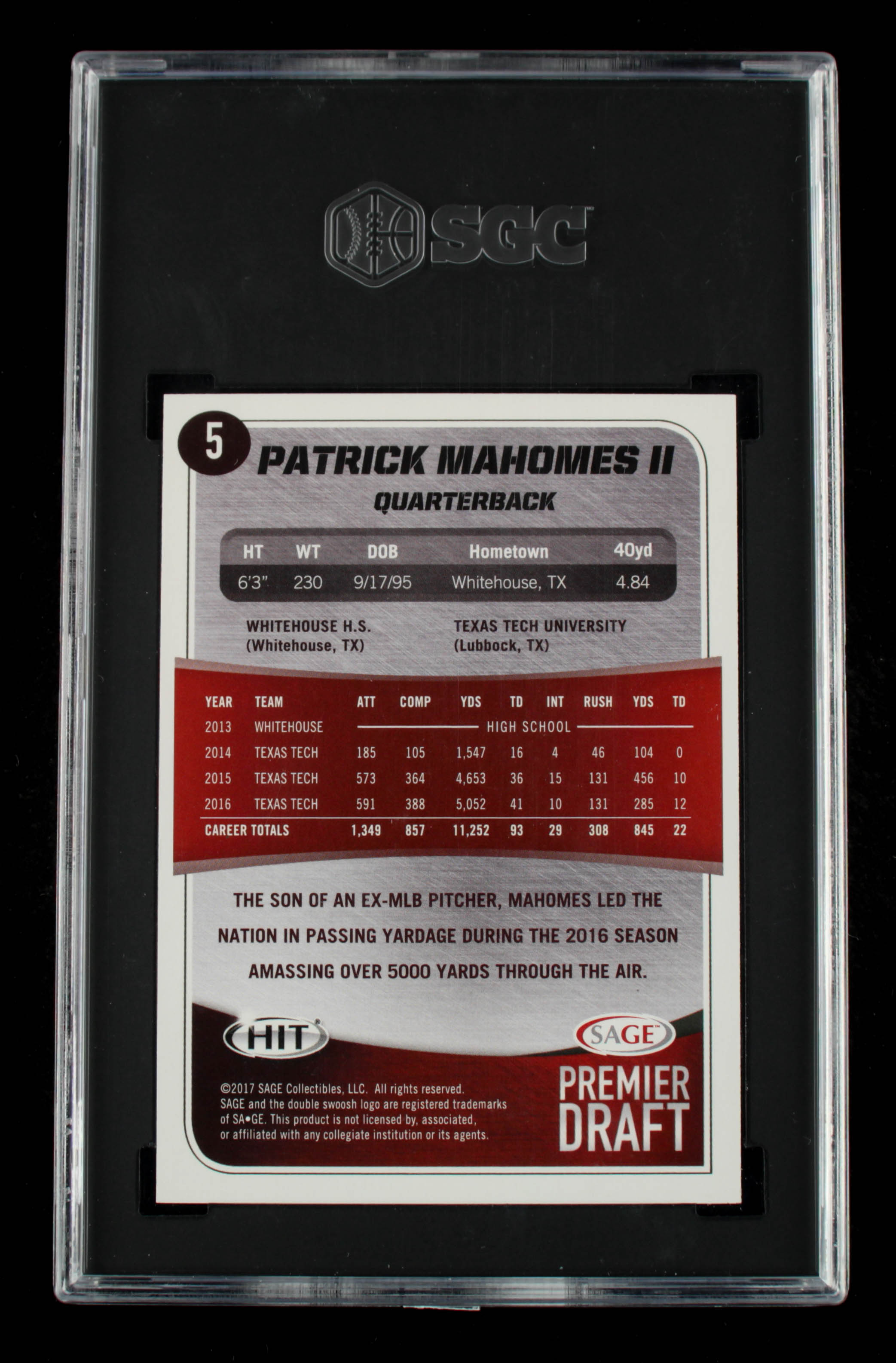 Patrick Mahomes 2017 SAGE HIT Premier Draft Silver #5 (SGC 10)