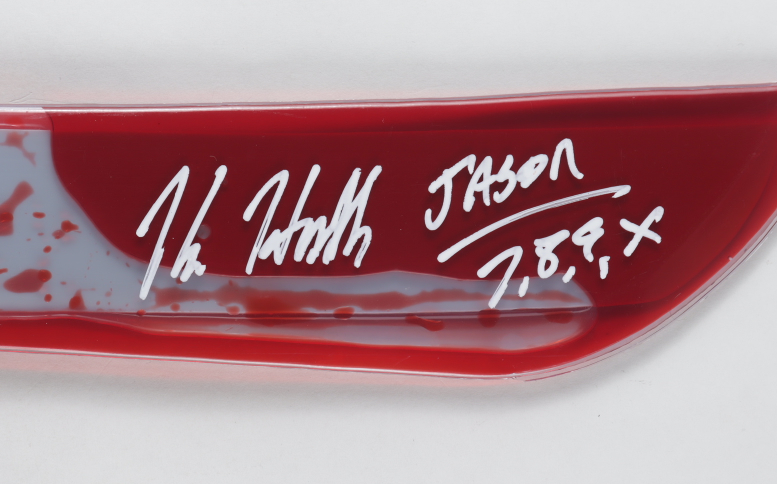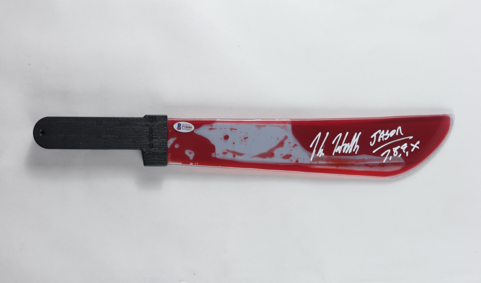 Plastic prop replica machete measures approximately 22" in length and has been hand-signed by Kane Hodder (Jason Voorhees).