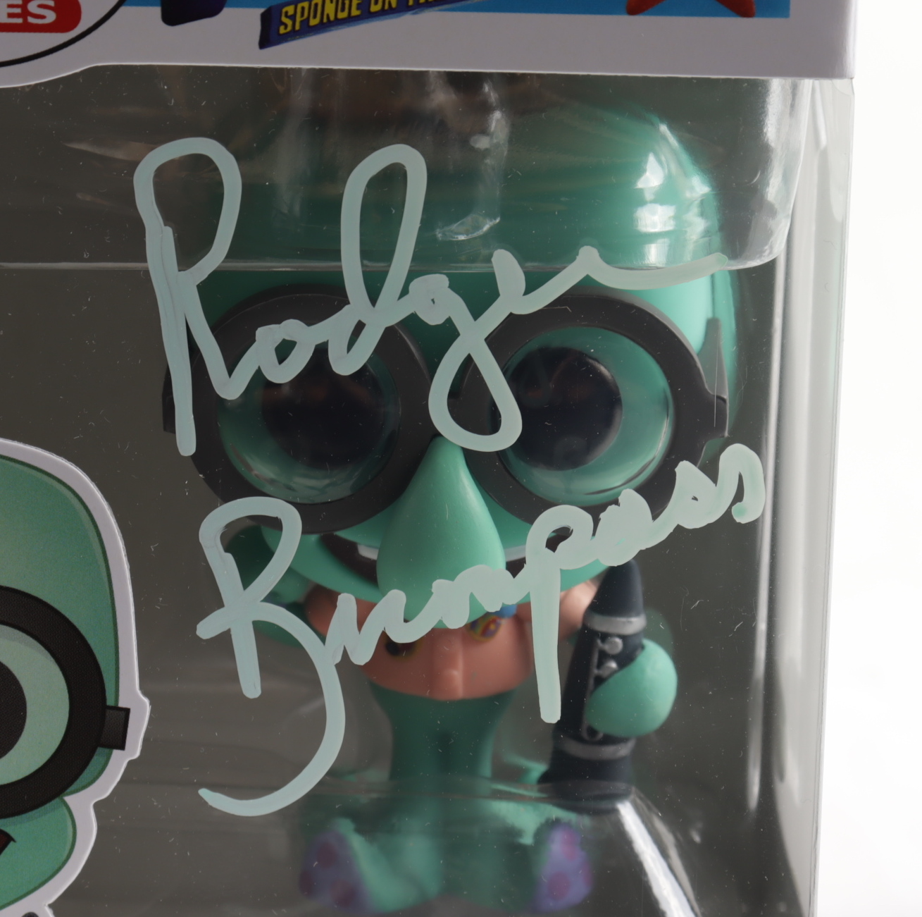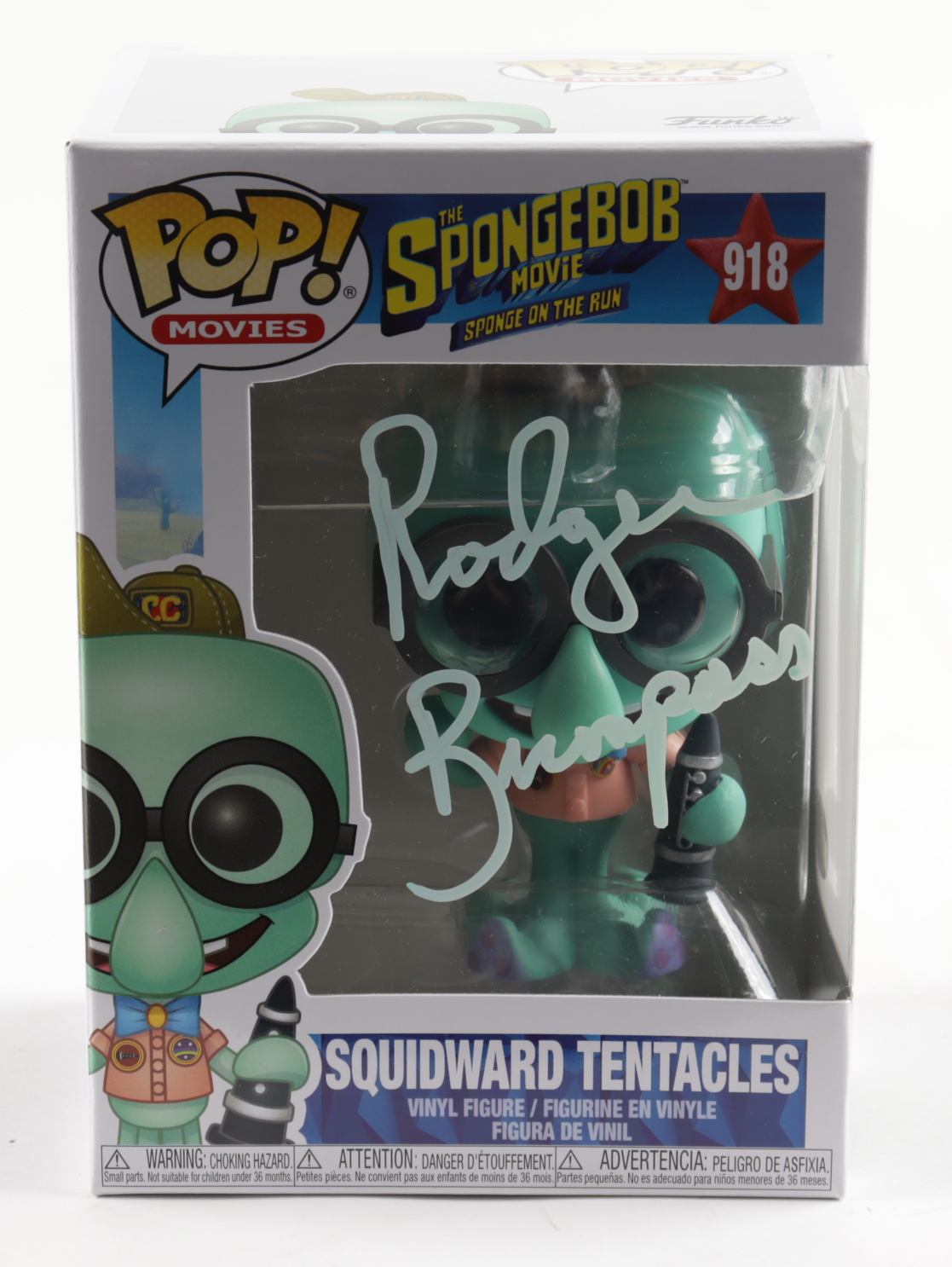 Funko Pop! figure measures approximately 4" tall and has been hand-signed on the packaging by Rodger Bumpass (Voice of Squidward Tentacles).