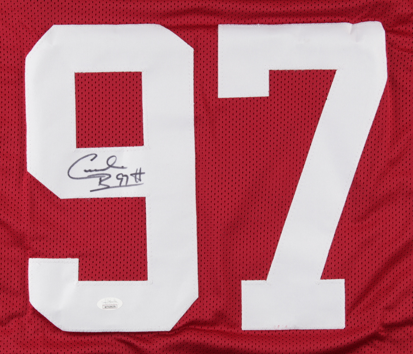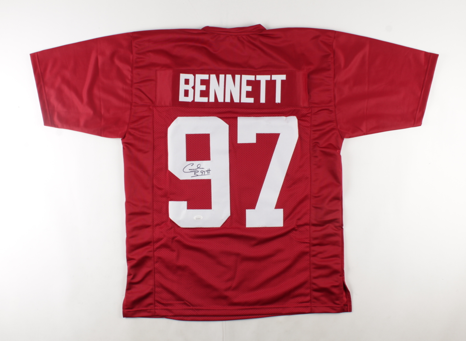 Custom on-field style jersey. Everything is sewn on, size XL. Hand-signed by Cornelius Bennett.