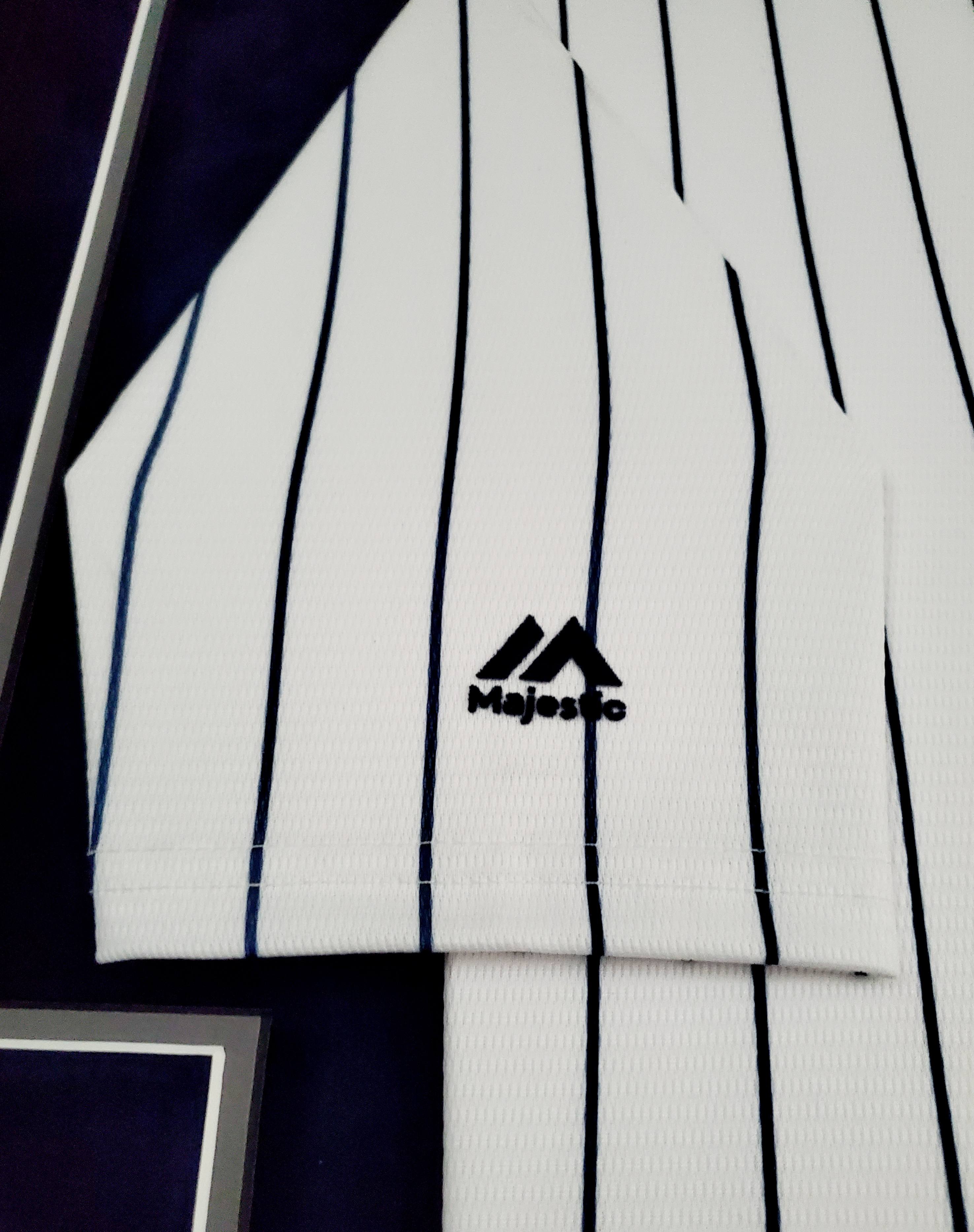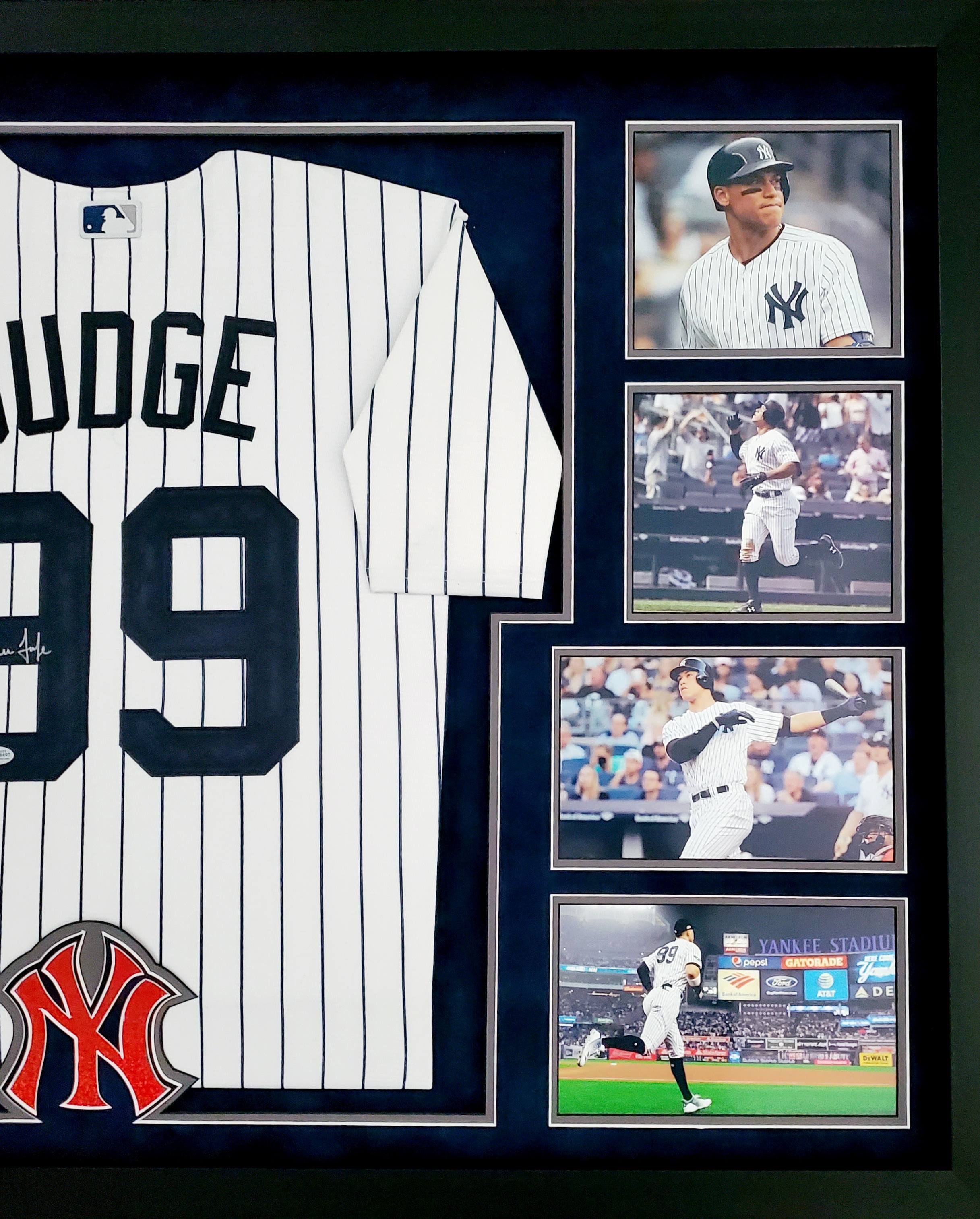 Custom frame measures 33" x 44" in size. Features a Majestic on-field style jersey that has been hand-signed by Aaron Judge (New York Yankees).