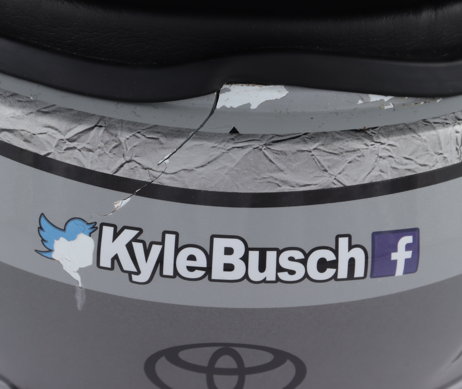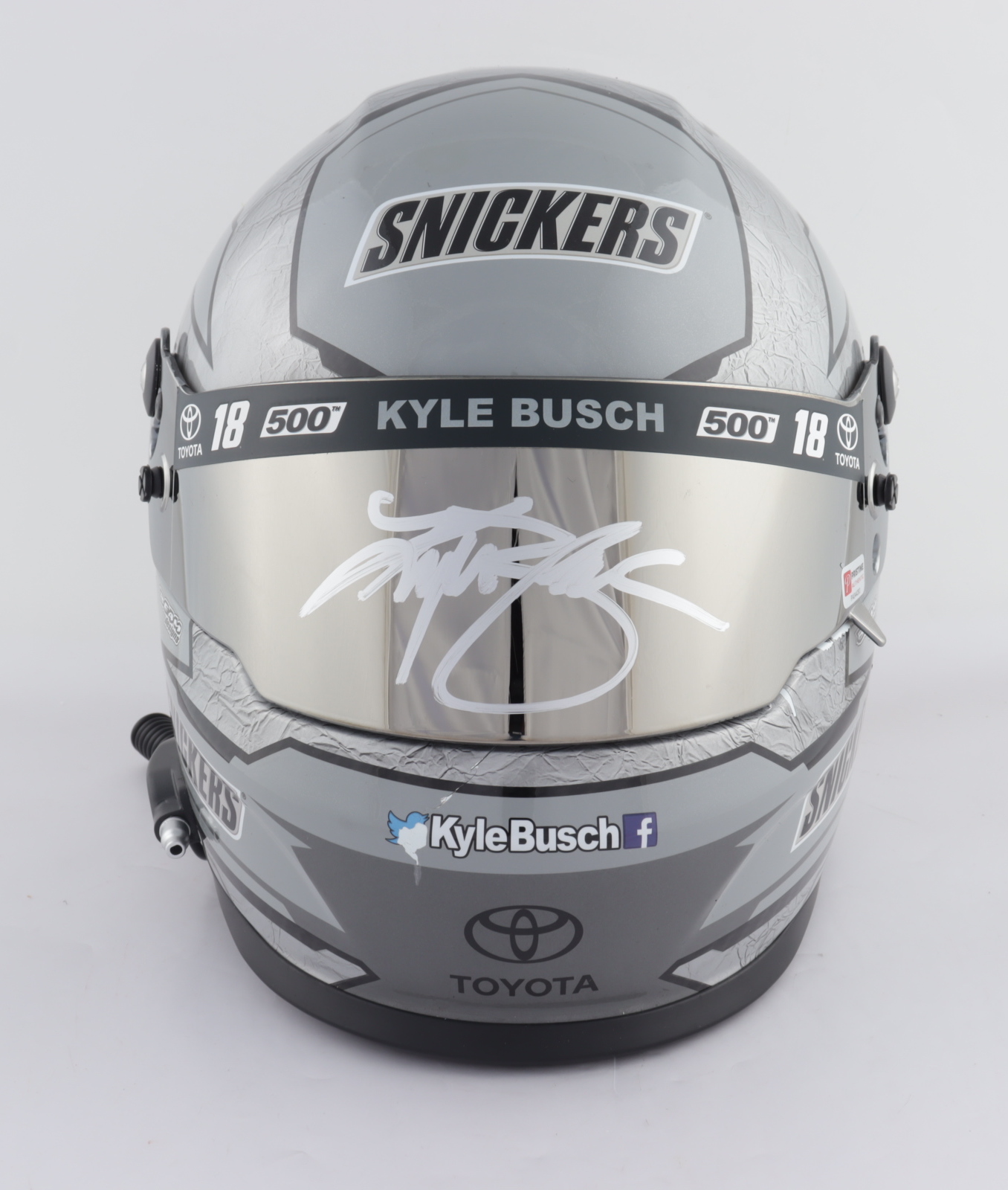 Full-size replica NASCAR helmet. The helmet has been hand-signed on the visor by Kyle Busch.