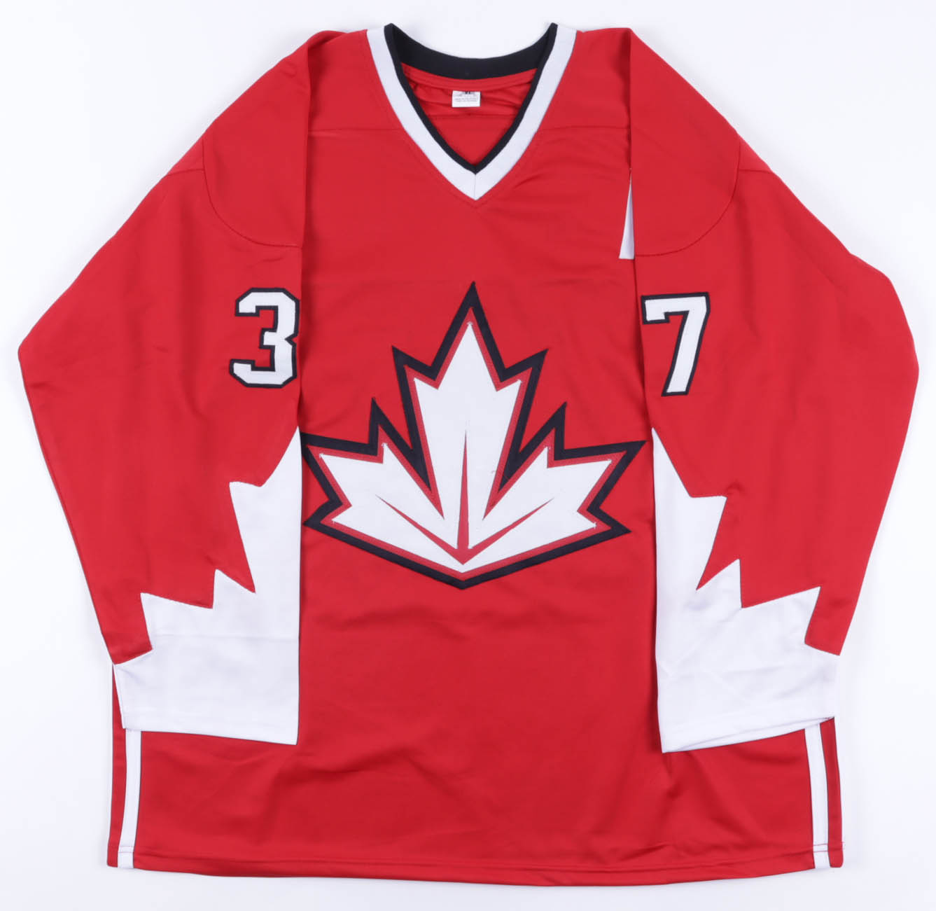 Custom on-ice style jersey. Everything is sewn on, size XL. Hand-signed and inscribed by Patrice Bergeron.