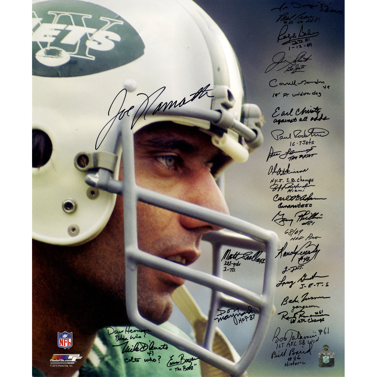 Photo measures 20" x 24" in size. Hand-signed in black felt-tip pen by members of the 1969 New York Jets including Joe Namath, Emerson Boozer, Matt Snell, Don Maynard, Bake Turner, Pete Lammons, Dave Herman, John Schmidt, Bob Talamini, Randy Rasmussen, Gerry Philbin, Paul Rochester, Carl McAdams, Al Atkinson, Ralph Baker, Larry Grantham, Bill Baird, Cornell Gordon, Randy Beverly, John Dockery, Earl Christy, Paul Crane, Jeff Richardson, and Mike D'Amato.