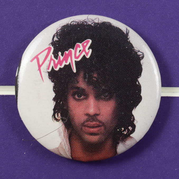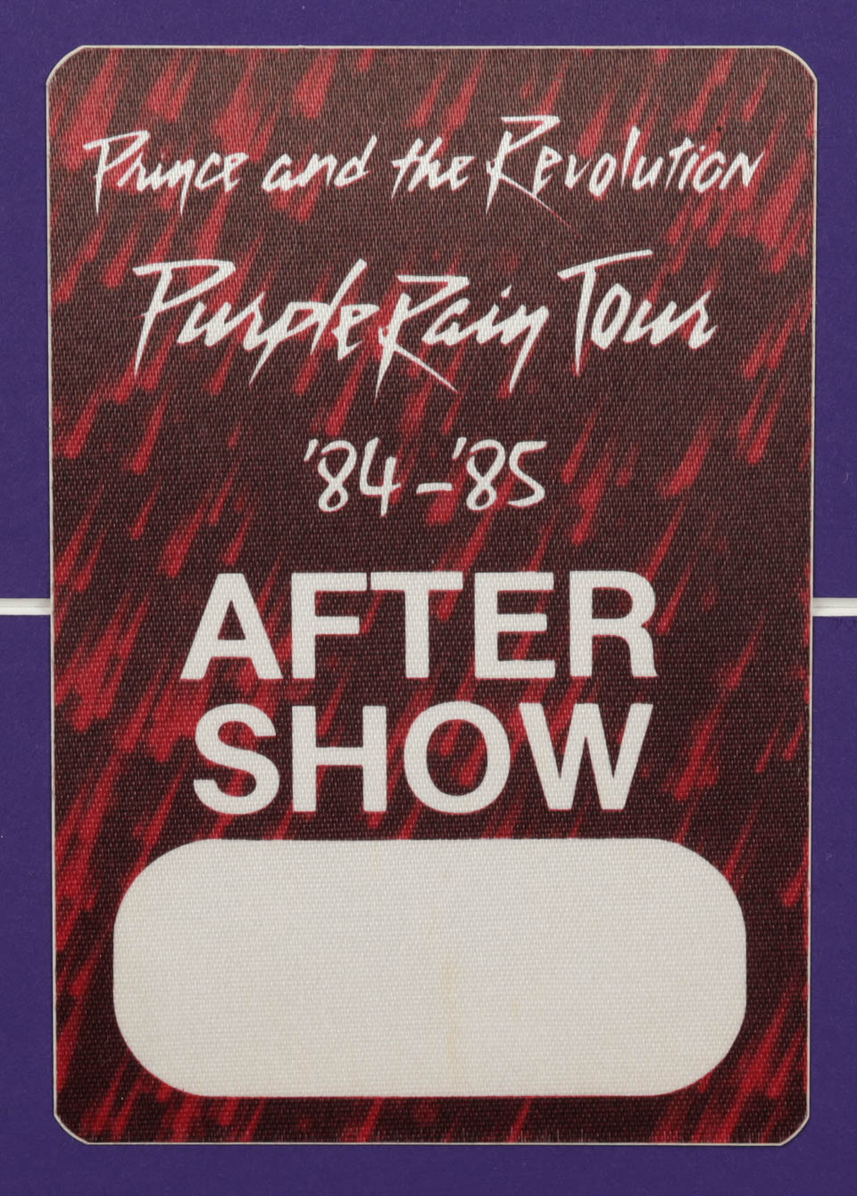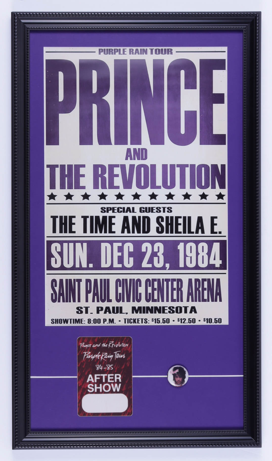 Custom frame measures 15" x 26" in size and features a Prince and the Revolution "Purple Rain Tour" poster. Display also features an original backstage pass and a concert pin.