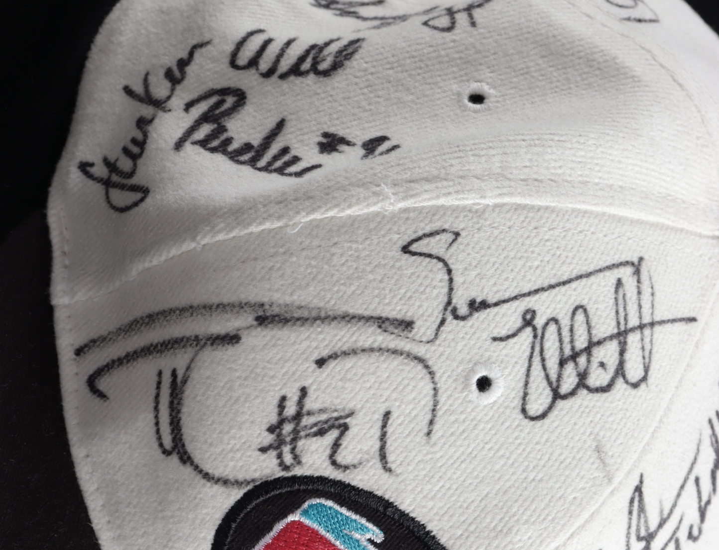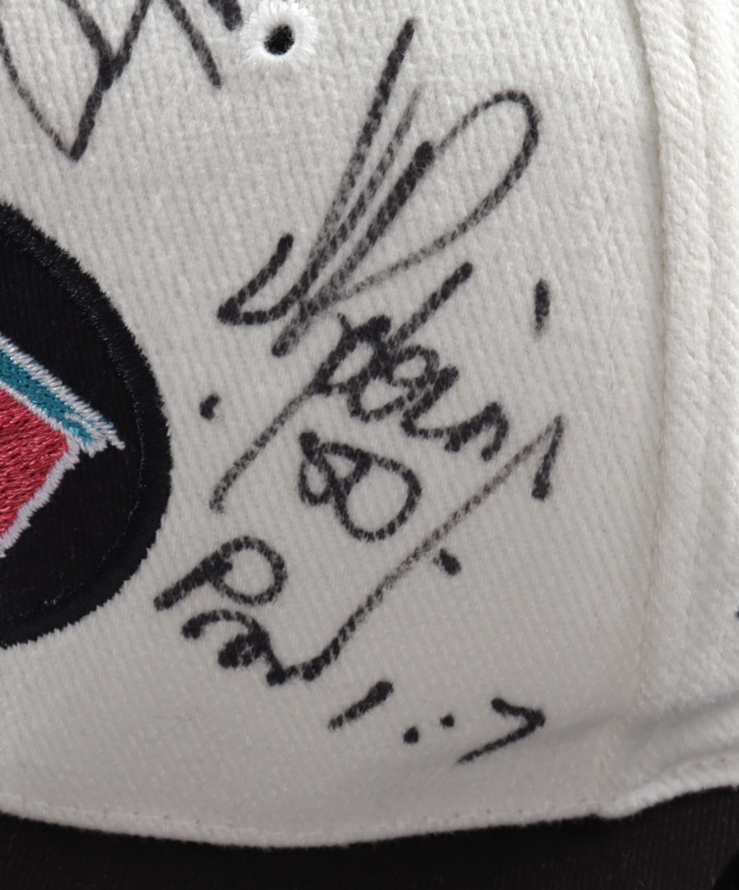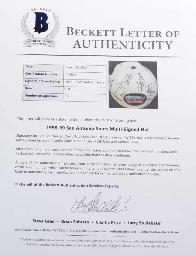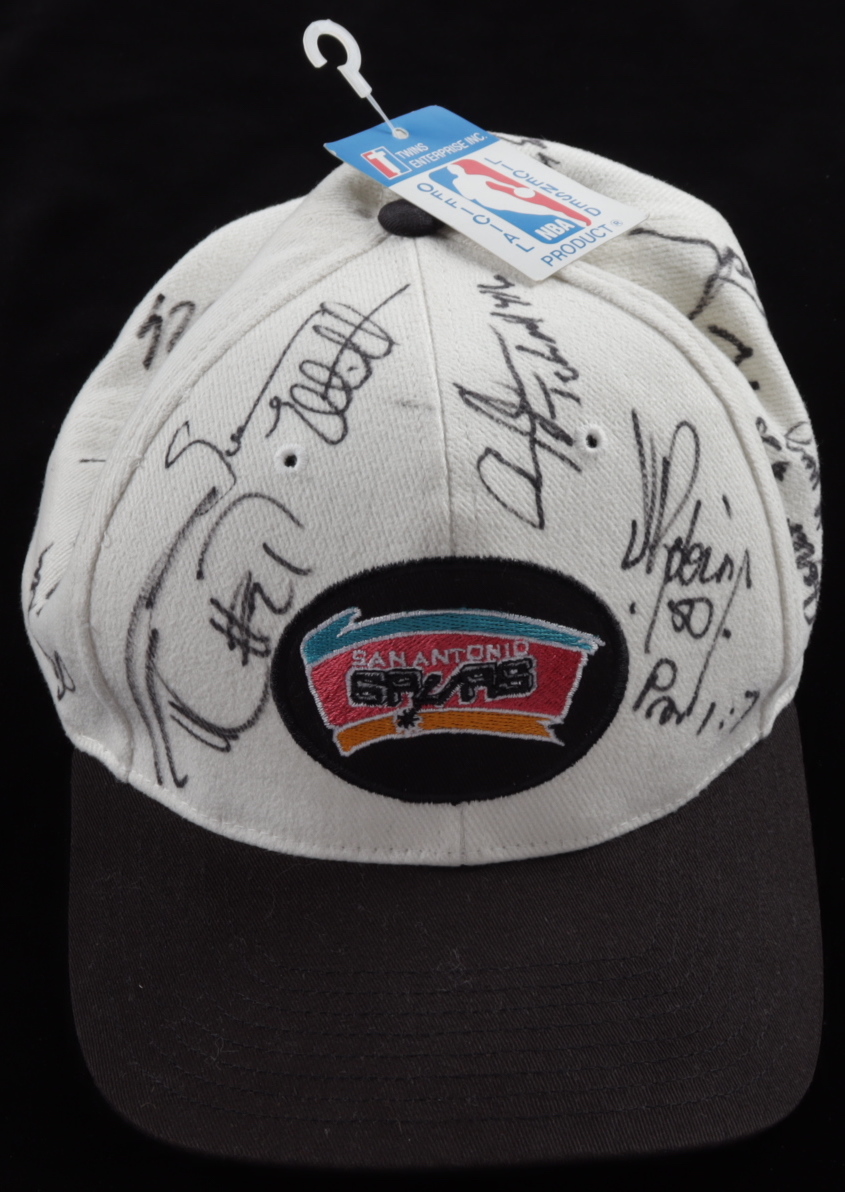 San Antonio Spurs adjustable hat has been hand-signed by (12) members of the 1998-99 team including Tim Duncan, David Robinson, Sean Elliott, Steve Kerr, Will Perdue, Avery Johnson, Jerone Kersey, Jaren Jackson, Anotonio Daniels, Mario Elie, Malik Rose and Andrew Gaze.