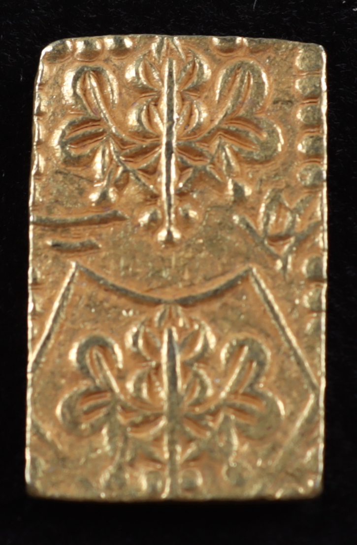 Minted from the early 17th century until just after the fall of the Tokugawa shogunate in 1869. Feudal Japanese gold coins are remnants of a time when Japan was still largely agrarian, feudal and isolated. At this point in its history, Japan was ruled by traditional samurai lords who had cultivated their warrior philosophy for more than a millennium. The Japanese word for silver is "gin" and their word for gold is "kin". Therefore, a one bu silver coin would be called an ichibu gin, which translates as "one-bu silver". Likewise, a similar one bu coin in gold would be called an ichibu kin, or "one-bu gold". Most Tokugawa period Japanese gold coins available in the market today are smaller one (ichi) or two (ni) shu or bu denominations. These coins are called isshu-kin (one-shu gold), nishu-kin (two-shu gold), ichibu-kin (one-bu gold) and nibu-kin (two-bu gold), respectively. These smaller shu and bu Japanese gold coins from the Tokugawa shogunate have an unusual rectangular shape surrounded by finely beaded borders that is reminiscent of a miniature bar or ingot. Covered in exotic Japanese calligraphy and stylized paulownia flowers, shu and bu gold coins unequivocally exude the style of traditional samurai Japan.